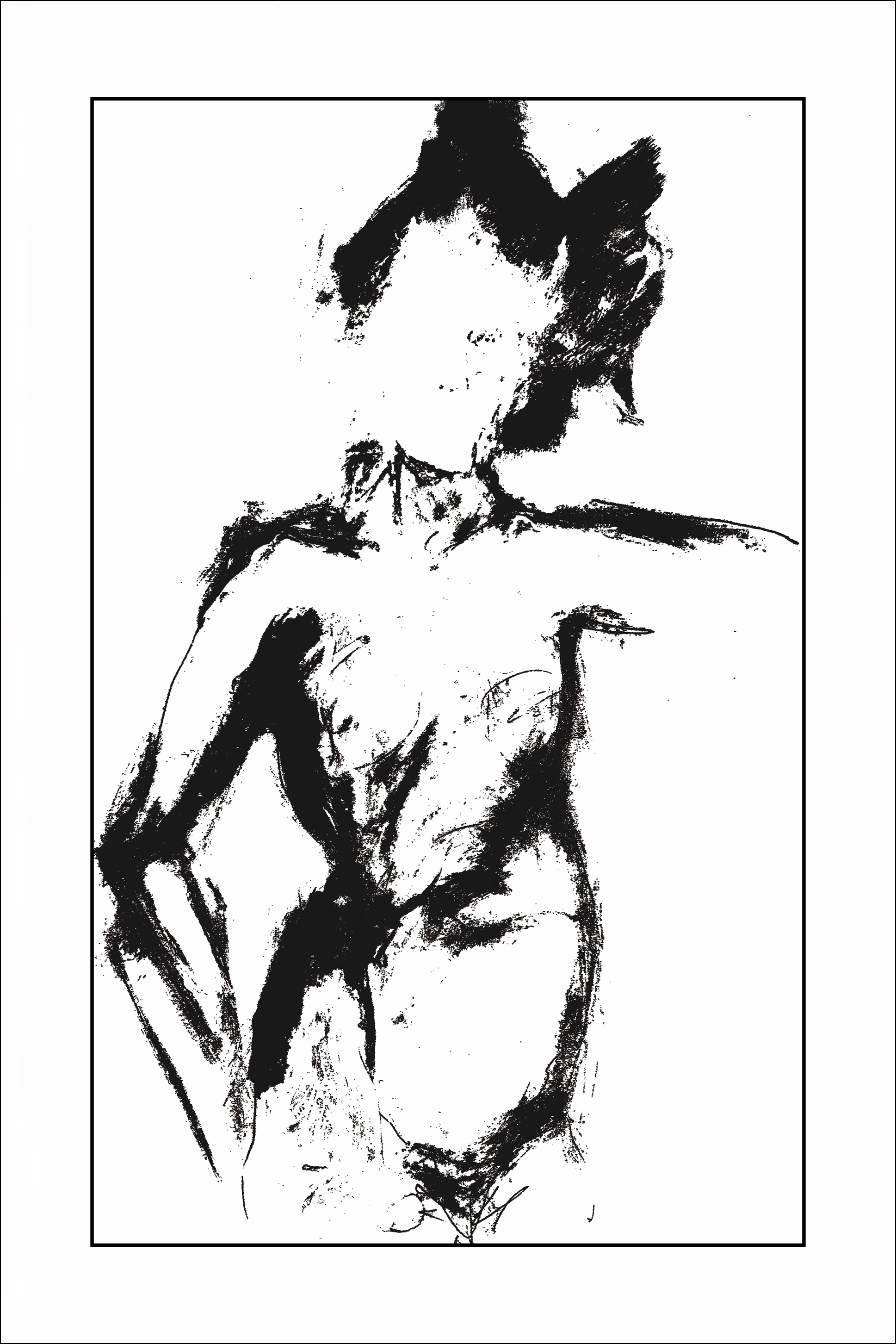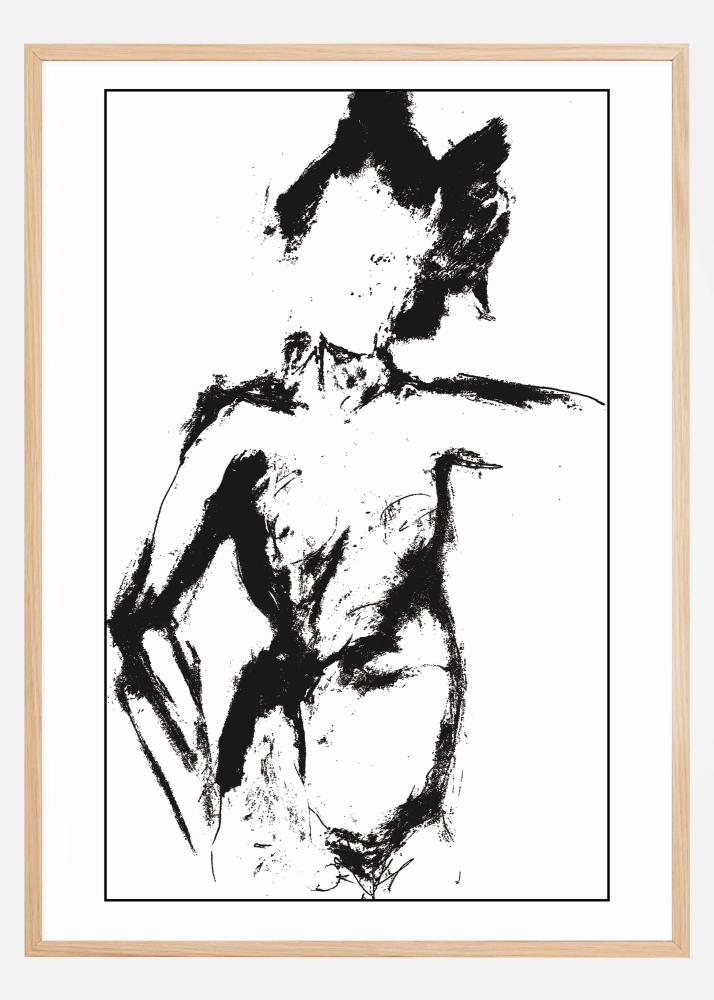 Ein Schwarz-Weiß-Poster eines Akt-Modells. Die dicken, breiten schwarzen Pinselstriche haben diese Frau in einem fast chiaroscuroartigen Stil geschaffen. Wenn man eine Weile darauf blickt, wartet man fast darauf, dass sie sich bewegt.