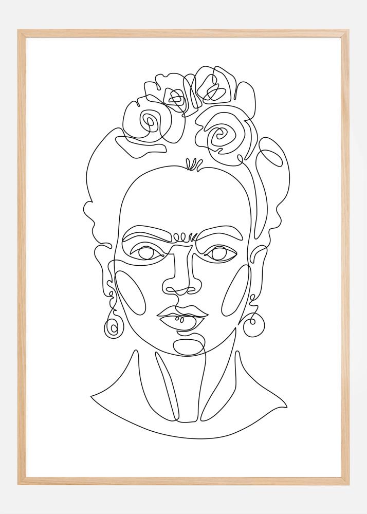 Dieses minimalistische Poster zeigt eine stilvolle Strichzeichnung einer Frauenfigur mit elegantem Aussehen, verziert mit Blumen im Haar und klassischen Ohrringen. Das Kunstwerk ist in einer einzigen, kontinuierlichen Linie gestaltet, die dem traditionellen Porträt eine moderne Note verleiht. Die Farbpalette ist sauber und einfach, beschränkt auf schwarze Linien auf einem weißen Hintergrund, was ein reduziertes Gefühl vermittelt, das gut in ein modernes oder minimalistisches Zuhause passt.