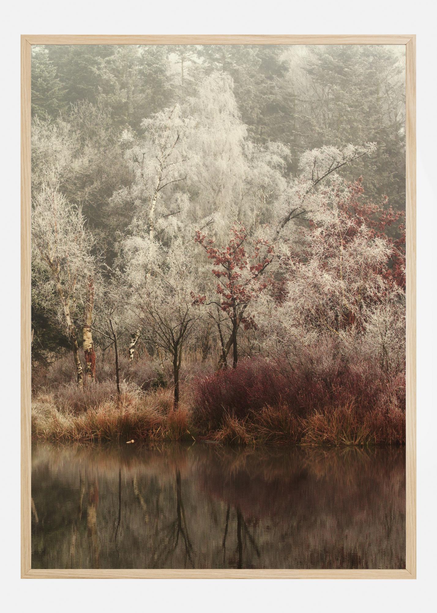 Ein stilles und ruhiges Poster eines gefrorenen Waldes. Ein klarer, stiller See befindet sich im Vordergrund, mit dunkelrotem Gras und frostbedeckten Bäumen im Hintergrund. Man kann die Stille und Ruhe, die dieses schöne, magische Bild ausstrahlt, fast spüren.