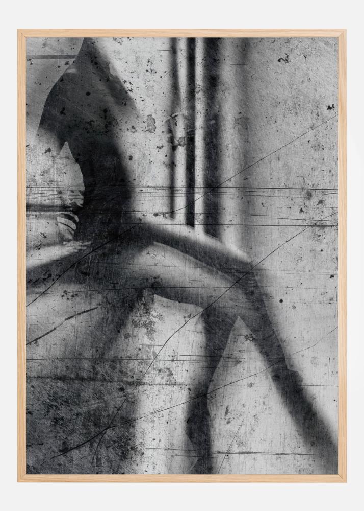 Ein abstraktes Poster einer Frau, die an einer Wand sitzt. Das schwarz-weiße Bild ist voller Linien und weicher Kanten, um dieses künstlerische, impressionistische Werk zu schaffen. Für einen dramatischen Look können Sie es an einer weißen Wand anbringen oder für noch mehr Dramatik mit einer kräftigen Farbe kombinieren.