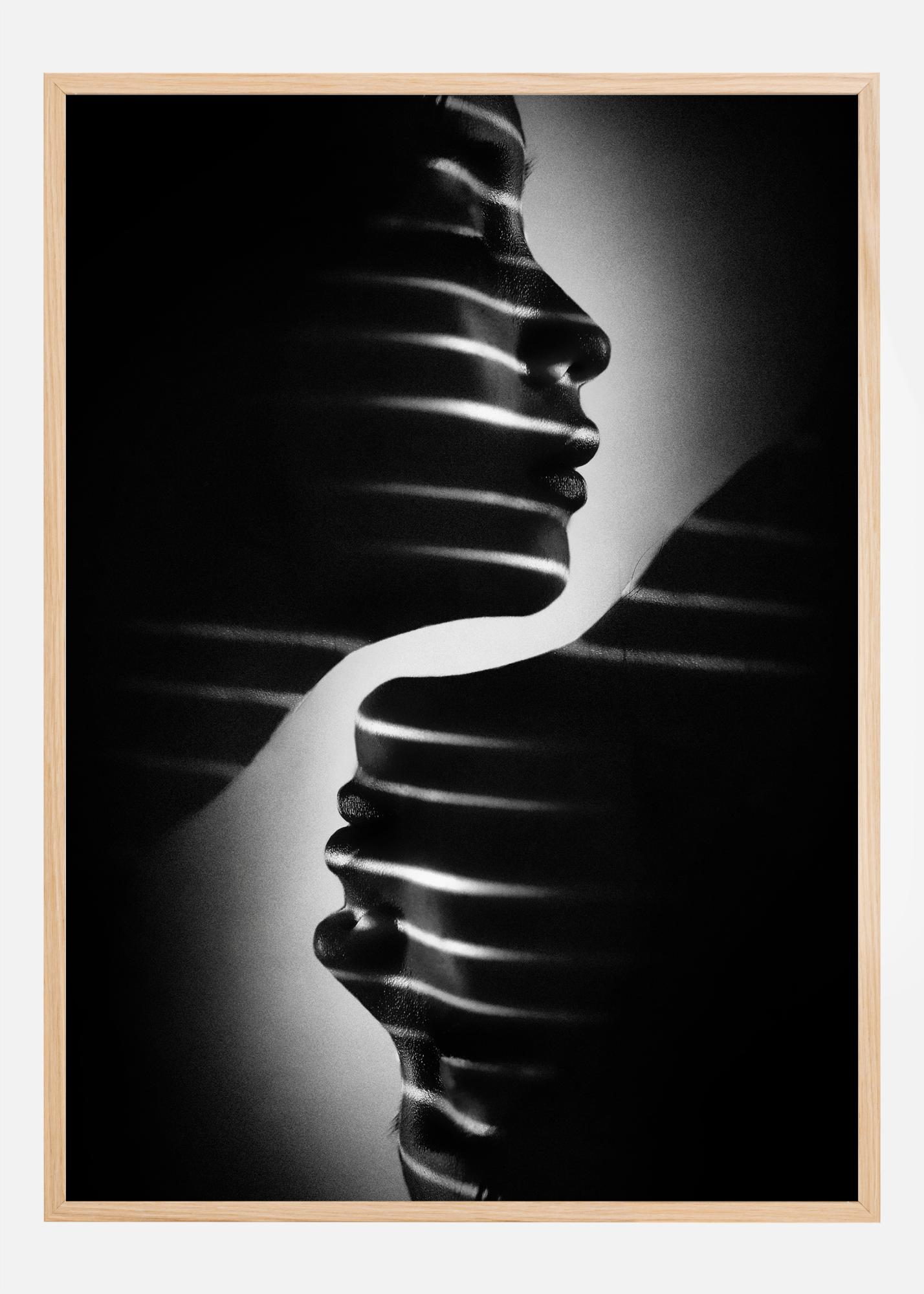 Ein dramatisches Doppelporträtposter mit zwei Gesichtern im Profil. Lichtbalken leuchten dramatisch über diese dunklen Gesichter mit einem Lichtstrahl dahinter, der einen Heiligenschein erzeugt. Hängen Sie es an eine weiße Wand, um die Dramatik dieses Schwarz-Weiß-Drucks zu verstärken.