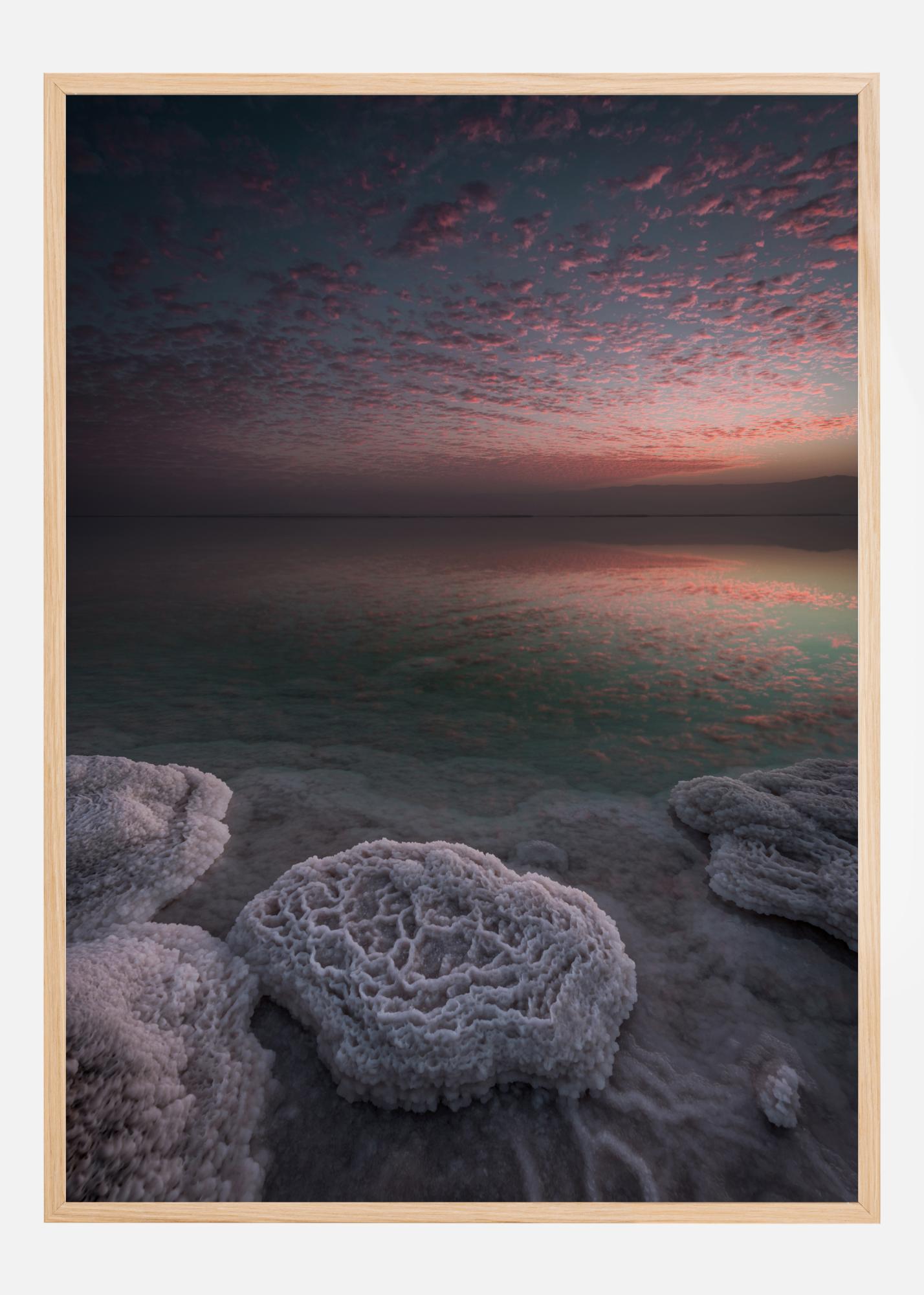 Ein wunderschönes Poster von einem weiten, offenen See. Im Vordergrund haben sich große Salzkristalle gebildet, die atemberaubende natürliche Muster und Designs bilden. Der See erstreckt sich in die Ferne und der Nachthimmel ist in einem dramatischen Rot und Blau gehalten, was die Magie dieses Bildes noch verstärkt.
