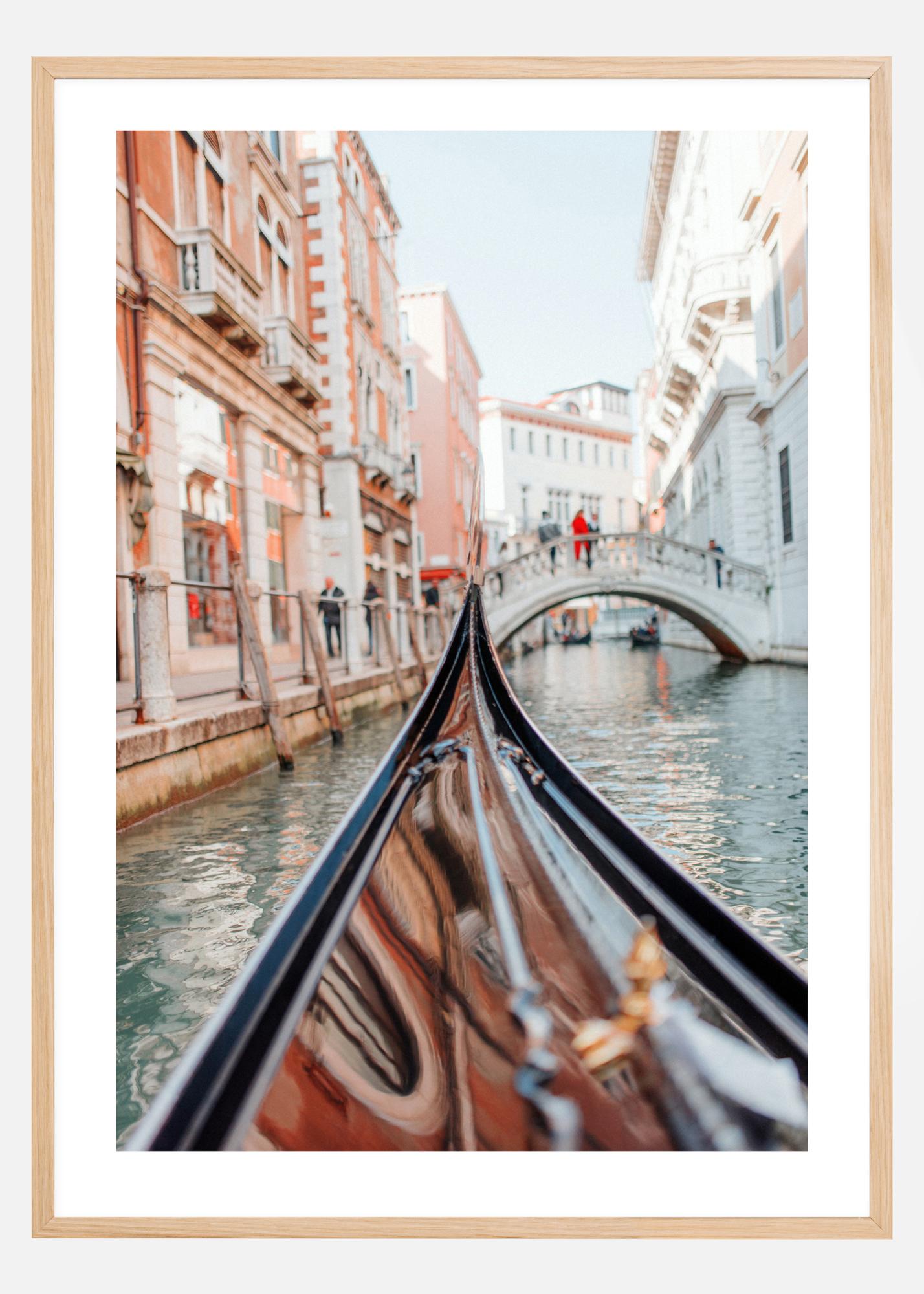 Ein klassisches Poster, das den Bug einer Gondel zeigt, die durch die Kanäle von Venedig fährt, zwischen zartrosafarbenen und weißen Häusern hindurch und auf eine weiße Brücke zusteuert, von der aus Menschen zusehen. Stellen Sie sich vor, Sie wären im Urlaub, wenn Sie dieses Poster mit nach Hause nehmen.