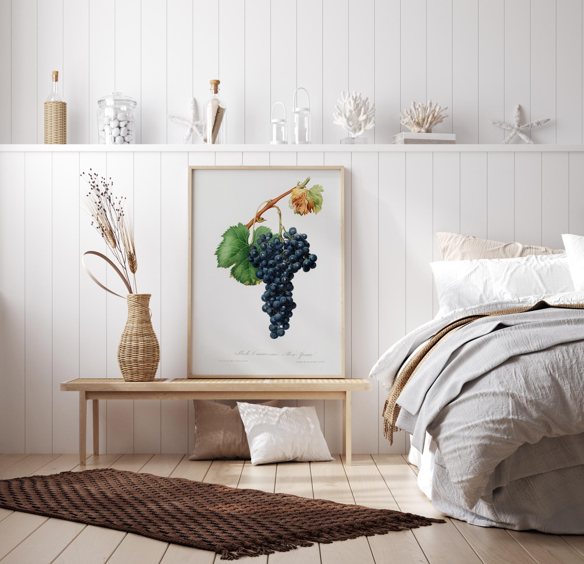 Ein detailliertes botanisches Poster mit einer Traube schwarzer Trauben an einer Rebe, die in der Mitte eines weißen Hintergrunds hängt. Die glänzenden schwarzen Trauben sehen saftig aus und baumeln verlockend in der Mitte des Bildes. Hängen Sie dieses Bild in Ihrer Küche auf, um sich vom Essen inspirieren zu lassen.