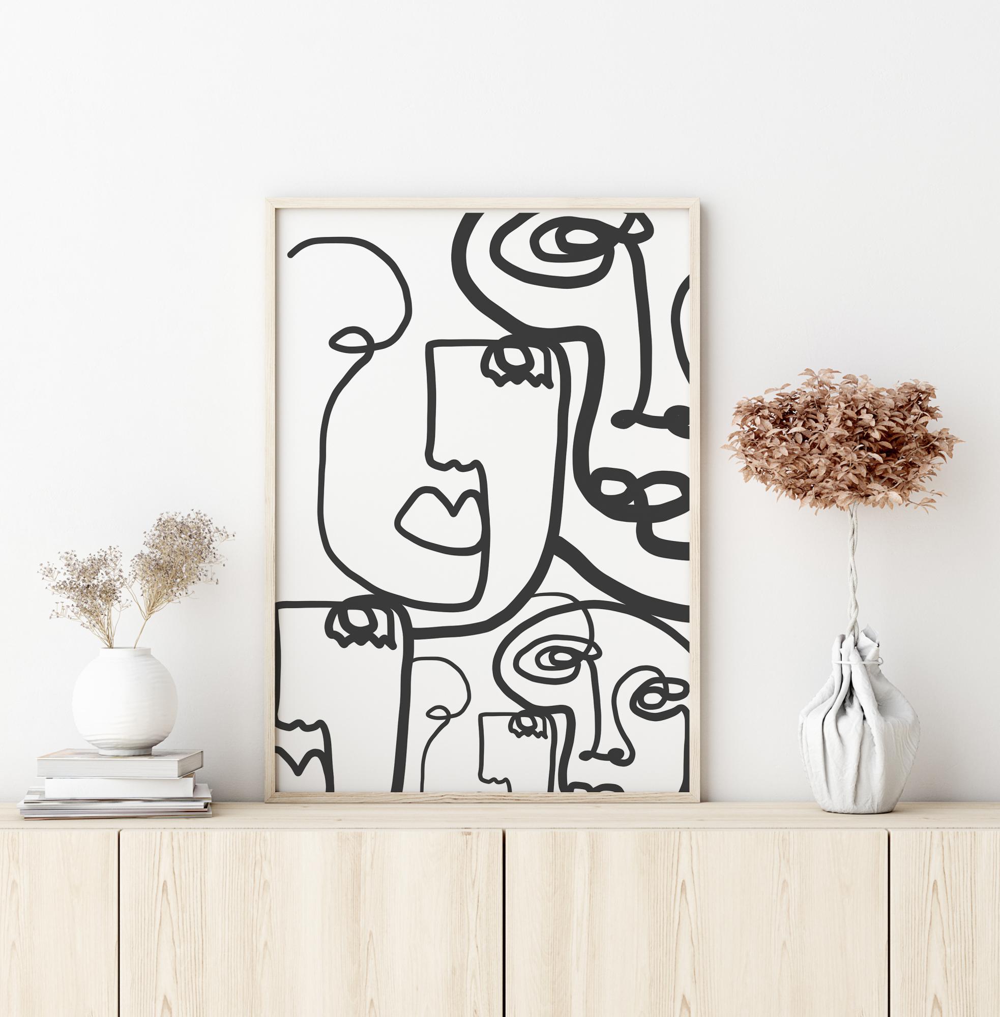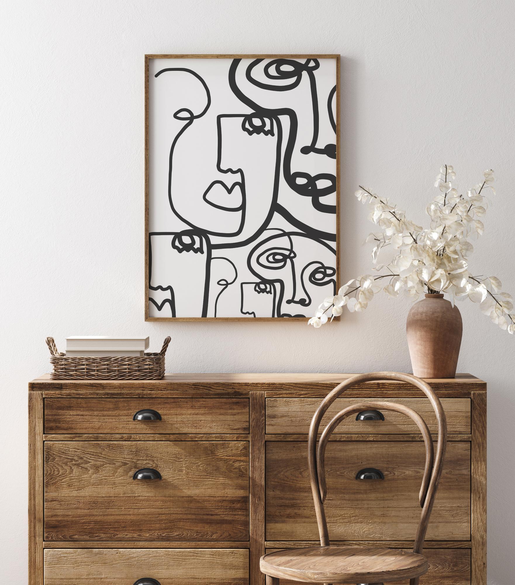 Ein dramatisches, abstraktes Poster mit vielen mit Linien gezeichneten Gesichtern. Dicke und dünne schwarze Linien füllen dieses Bild und bilden fünf verschiedene Gesichter. Die Linien wirbeln durch den weißen Hintergrund, so dass Sie sich konzentrieren müssen, um alle Gesichter zu finden, die in diesem geschäftigen Bild versteckt sind.
