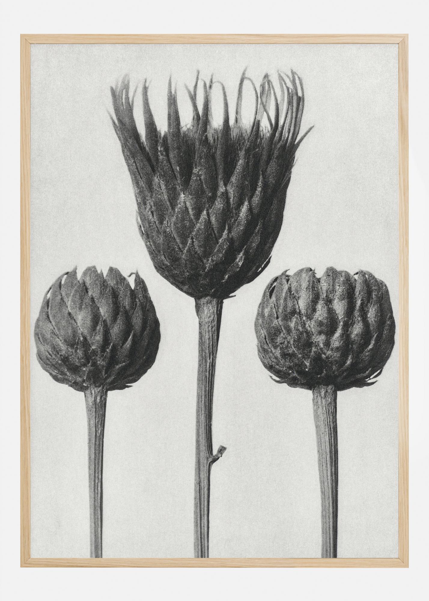 Ein Naturposter, das drei graue Blumen mit einem Stiel zeigt. Die drei grauen Blumen stehen hoch auf einem weißen Hintergrund und sind fast nebeneinander angeordnet. Die graue Blume im Vordergrund hat sich weiter geöffnet als die kleinen Blüten. Der ideale Druck, um ihn in Ihrem Wintergarten aufzuhängen.