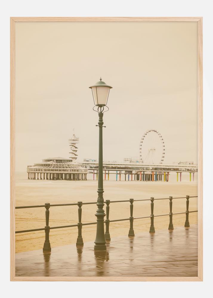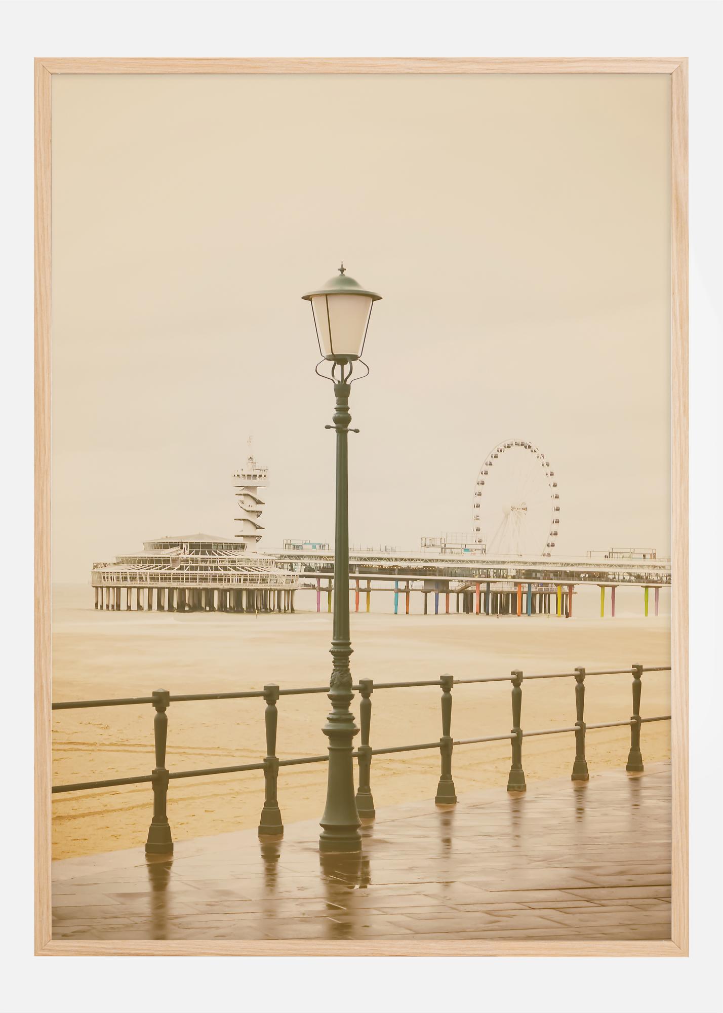 Dieses nostalgische Poster weckt das Gefühl eines langsamen, träumerischen Tages am Meer. Eine altmodische Laterne steht im Vordergrund, ein stiller Wächter über der leeren Strandpromenade mit ihrem klassischen Geländer. Im Hintergrund ist ein Pier mit einem Aussichtsturm und einem großen Riesenrad zu sehen, das ein Gefühl zeitloser Vergnügungspark-Romantik vermittelt. Die sanften Sepia- und Beigetöne verstärken das Gefühl einer vergangenen Ära und laden zum Nachdenken ein.