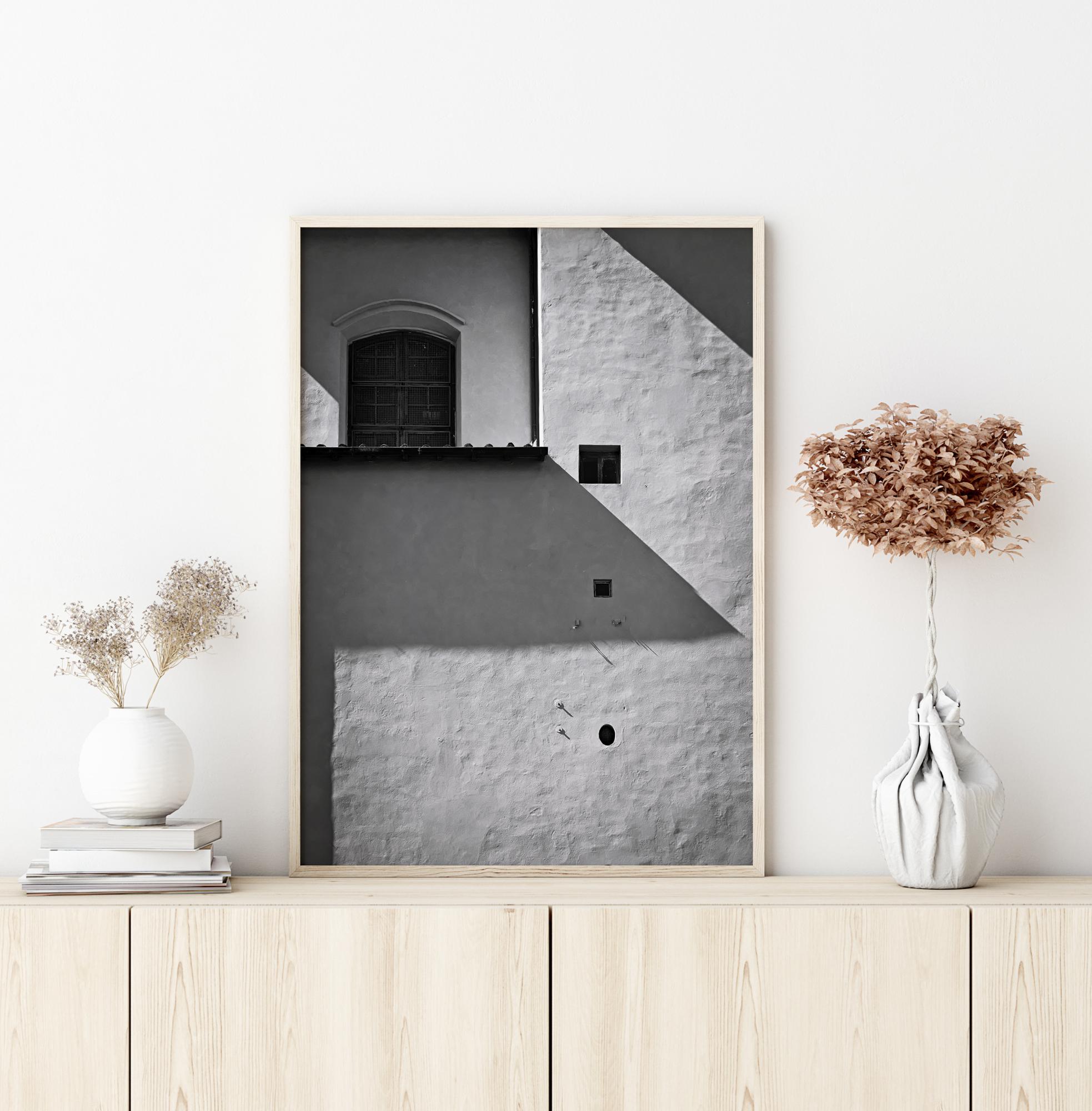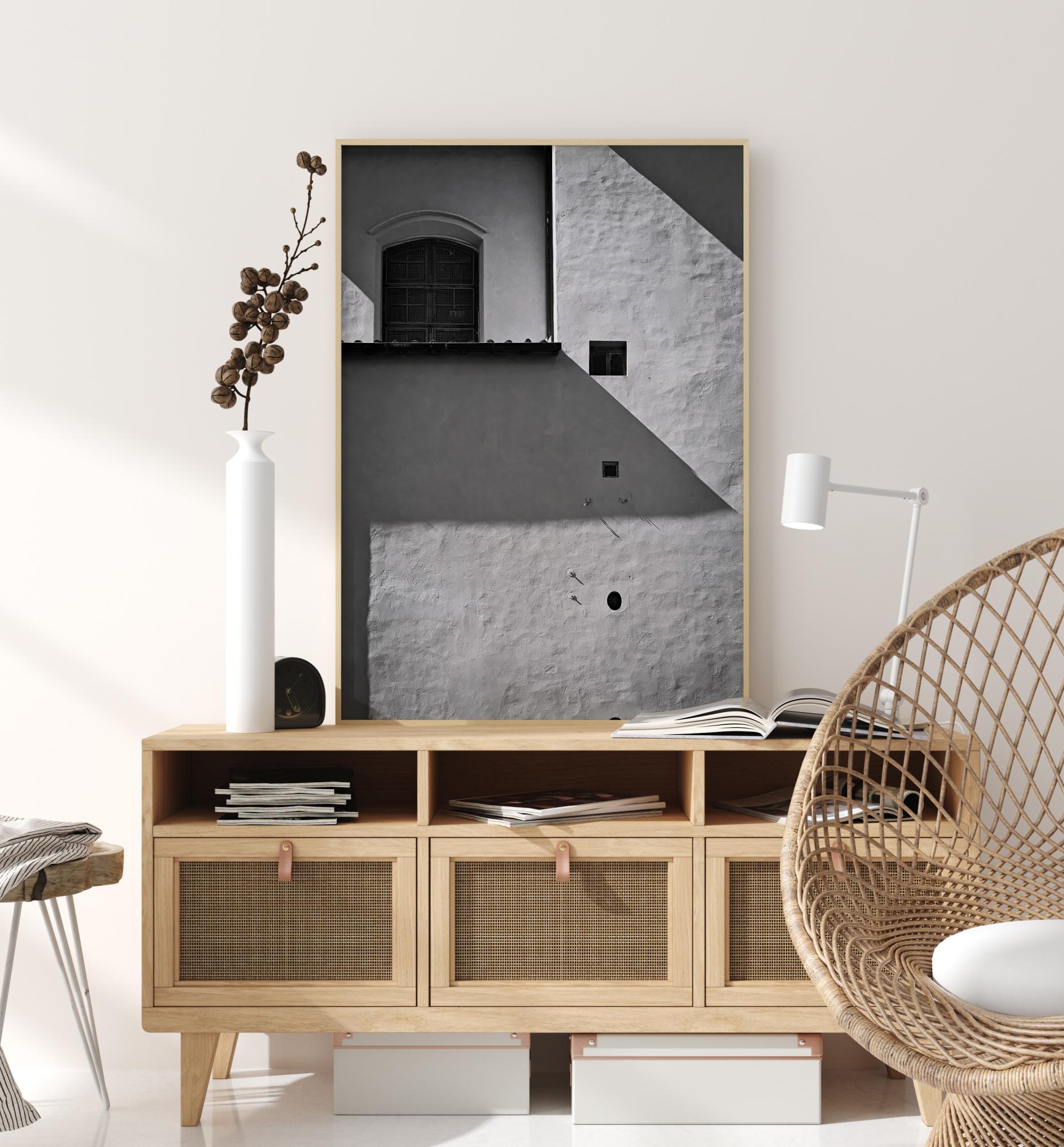 Ein einfacher, aber schöner Schwarz-Weiß-Druck mit einer braunen Holztür in der Mitte des Bildes. Das natürliche Sonnenlicht wirft einen Schatten auf die Wand. Auf der rechten Seite des Bildes sind vier kleine braune Löcher zu sehen, die untereinander angeordnet sind. Lassen Sie Ihrer Fantasie freien Lauf, um herauszufinden, was sich hinter der großen Holztür befindet.