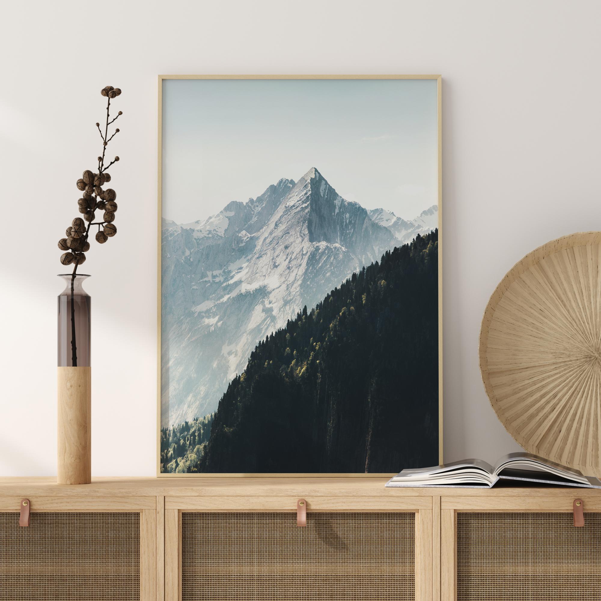 Eine malerische Landschaft mit schneebedeckten Bergen vor einem blassblauen Himmel. Im Vordergrund verdeckt ein dunkelgrüner Wald teilweise den Blick auf die Berge und schafft eine schöne Winteratmosphäre. Ein perfekter Druck zum Aufhängen über Ihrem Kamin.