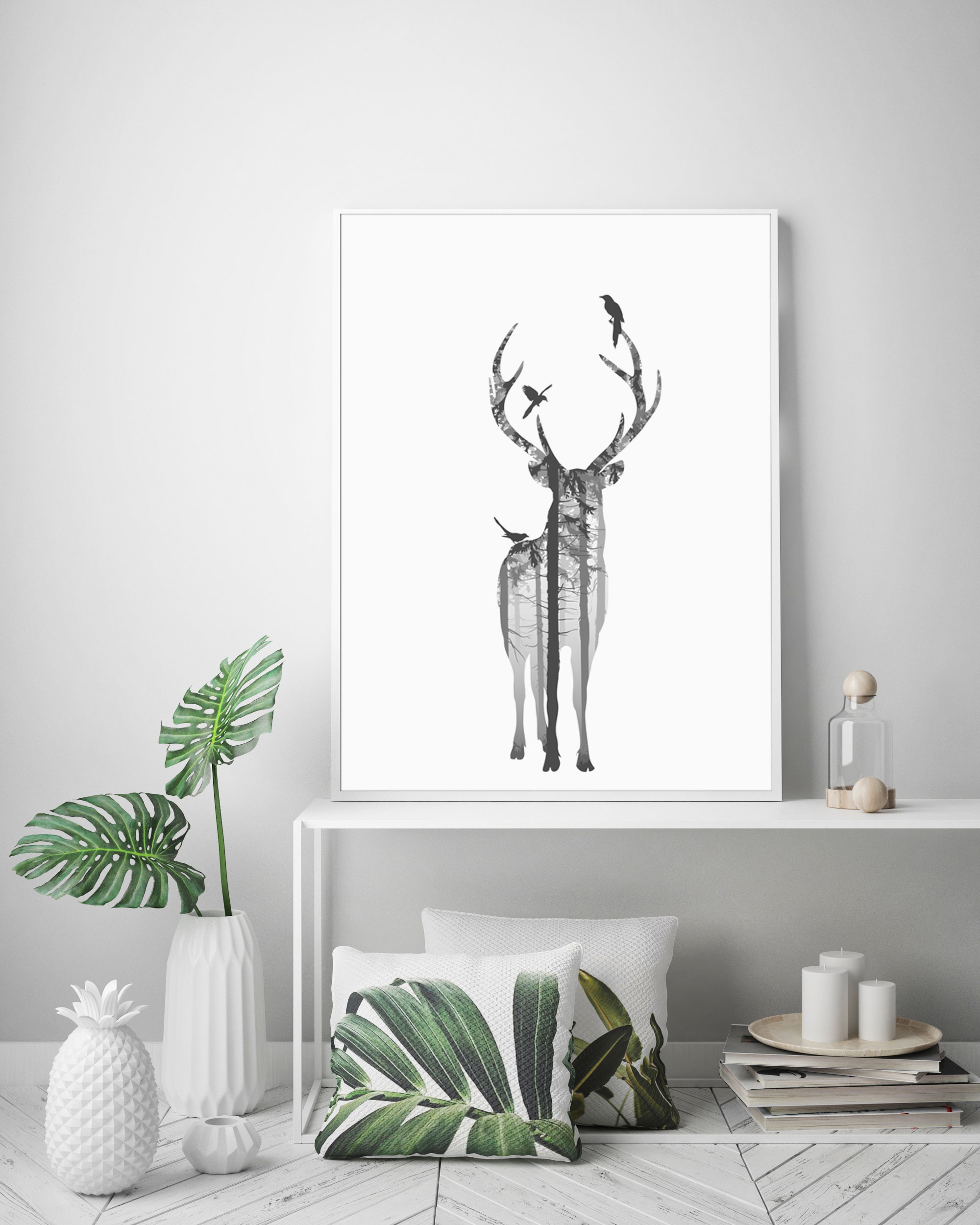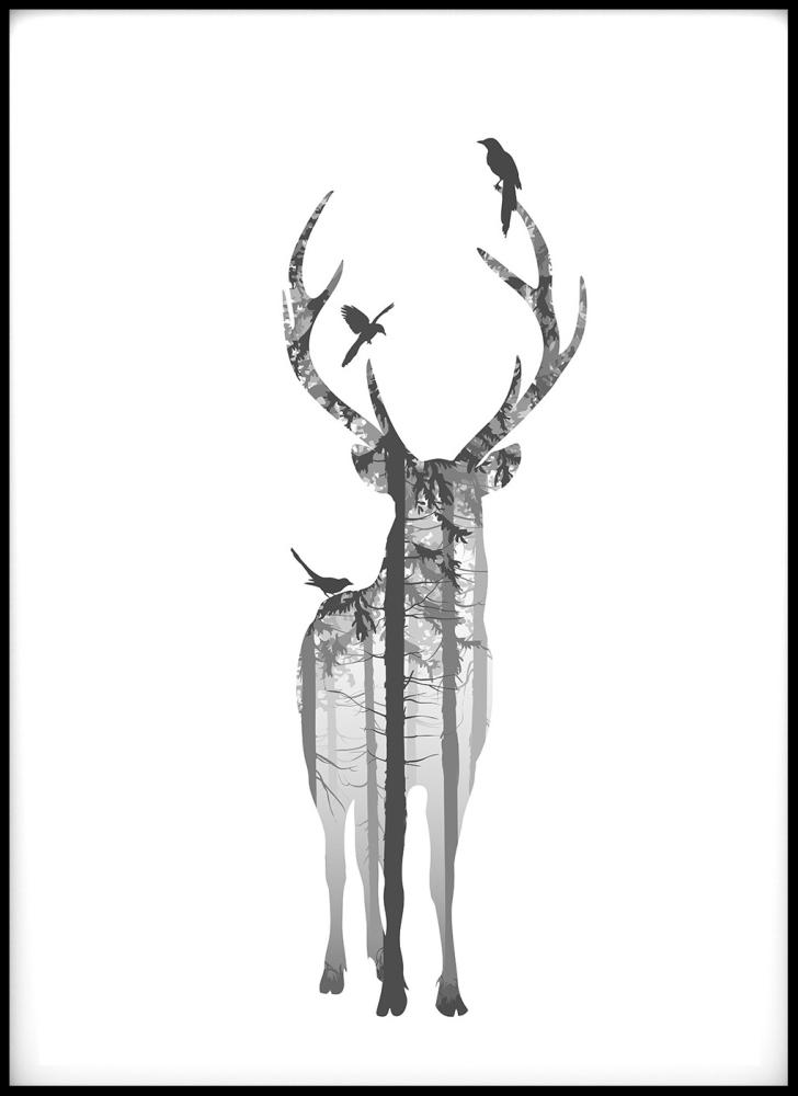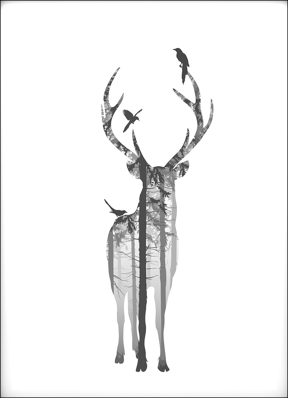 Grafische Illustration mit der Silhouette eines Hirsches. In der Silhouette sieht man die Schatten von Ästen und Vögel ruhen sich auf der Silhouette des Hirsches aus. Dieses spannende und suggestive Motiv in Grautönen eignet sich gut als Geschenk für Hirschliebhaber oder auch als weiteres Motiv an einer Bilderwand mit anderen Naturbildern. Das Poster lässt sich gut mit einem einfachen, eleganten Rahmen kombinieren, der in einer dezenten Farbe gehalten ist.