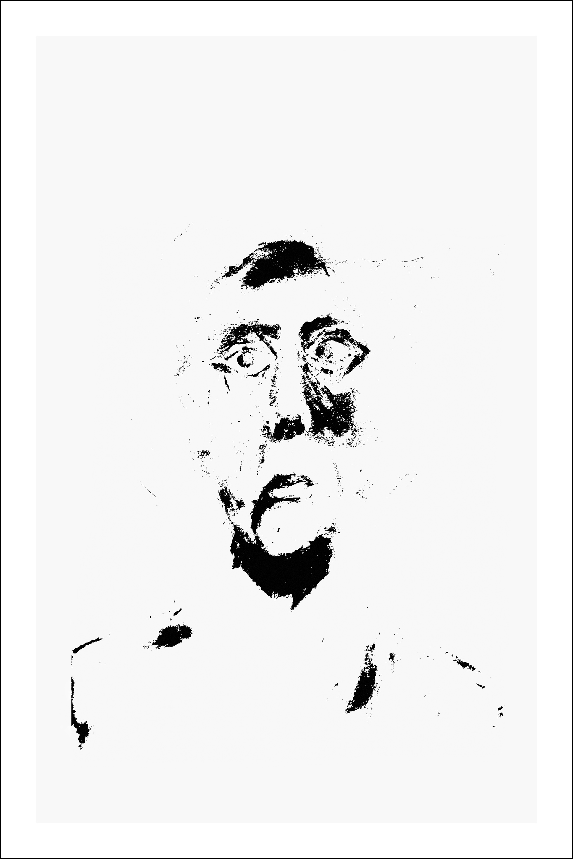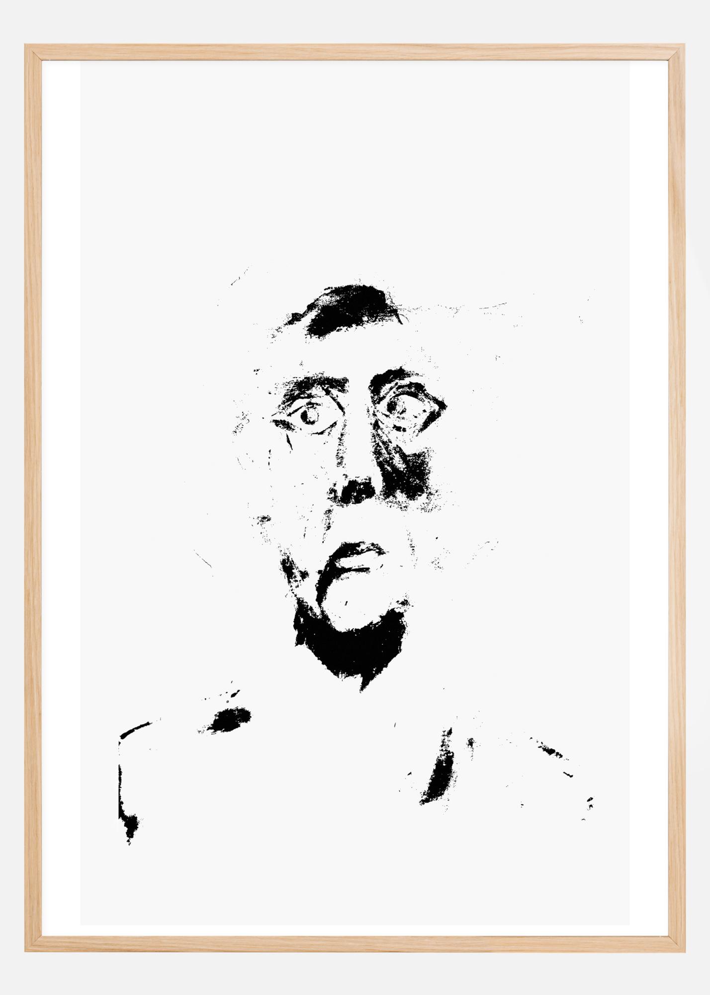 Ein unheimliches Kopf-Schulter-Porträt in Schwarz-Weiß. Vor einem weißen Hintergrund heben die dunklen Schattierungen das Haar, die Wangen und den Hals der Figur hervor. Die großen Augen der Figur drücken Furcht und Geheimnis aus. Ein trauriger und unheimlicher Druck, der Angst vermittelt.