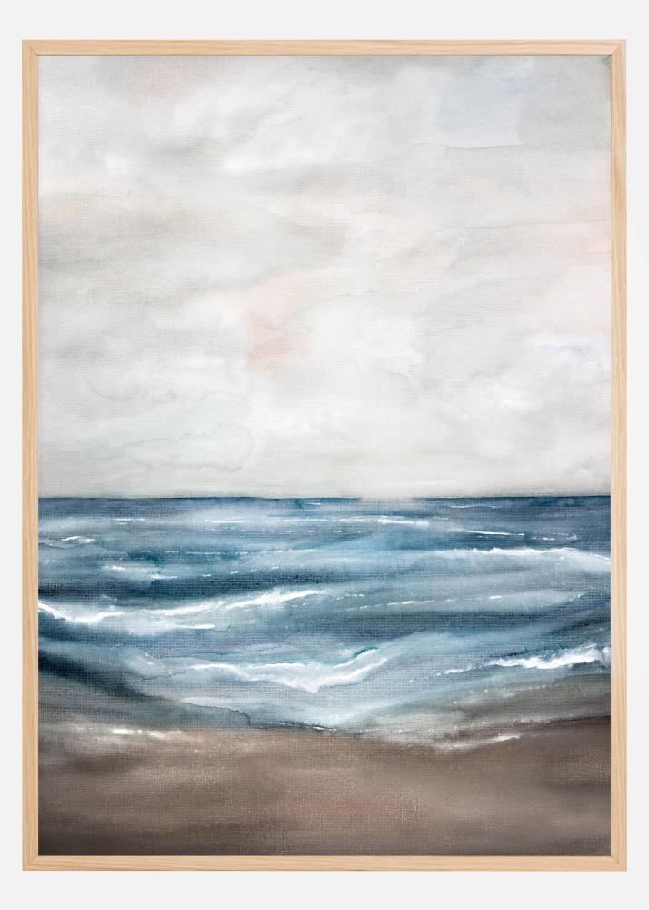 Ein wunderschönes Aquarell mit einer rauen See und einem hellgrauen Himmel. Ein nostalgisches und doch kraftvolles Gemälde, das die Stärke und Macht des Meeres hervorhebt. Das braune Meer im Vordergrund sorgt für einen zusätzlichen Farbtupfer, der eine stürmische Atmosphäre schafft. Spüren Sie die Meeresbrise, wenn Sie dieses Bild aufhängen.