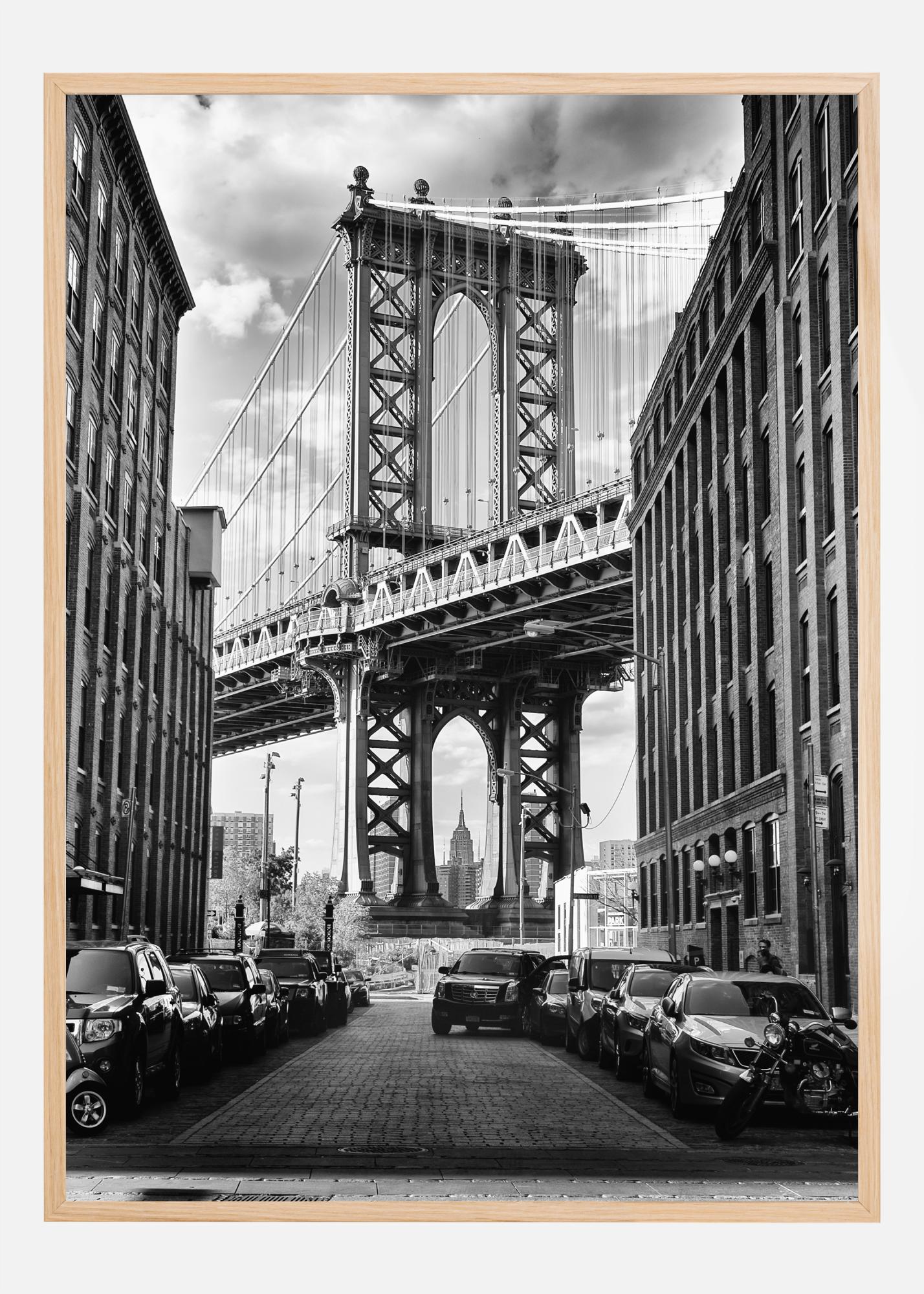 Ein schwarz-weißes Architekturposter der Manhattan Bridge. Unter einem wolkenverhangenen Himmel sind auf beiden Seiten der Straße Reihen von Autos geparkt. In der Ferne ragt das prächtige Empire State Building empor. Ein perfekter Druck, der in einer supermodernen Umgebung aufgehängt werden kann.