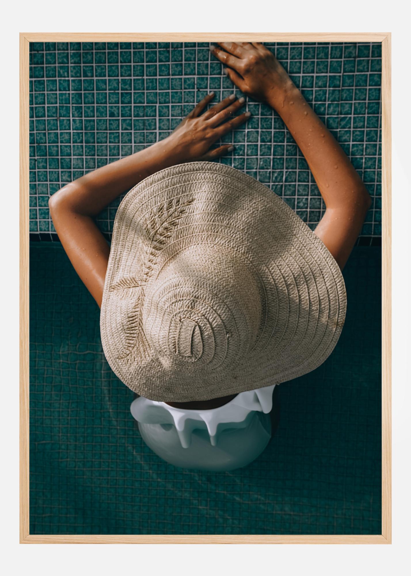 Die Detailgenauigkeit des Hutes und die spiegelglatte Wasseroberfläche, zusammen mit den weichen Schatten und der sonnigen Stimmung, beschwören ein Gefühl von faulen Sommertagen und langen, angenehmen Ferienmomenten herauf. Es ist ein ideales Plakat für das Badezimmer, einen spaähnlichen Raum oder jeden anderen Ort, an dem man ein Gefühl der Entspannung und des Entkommens aus dem Alltag hinzufügen möchte.