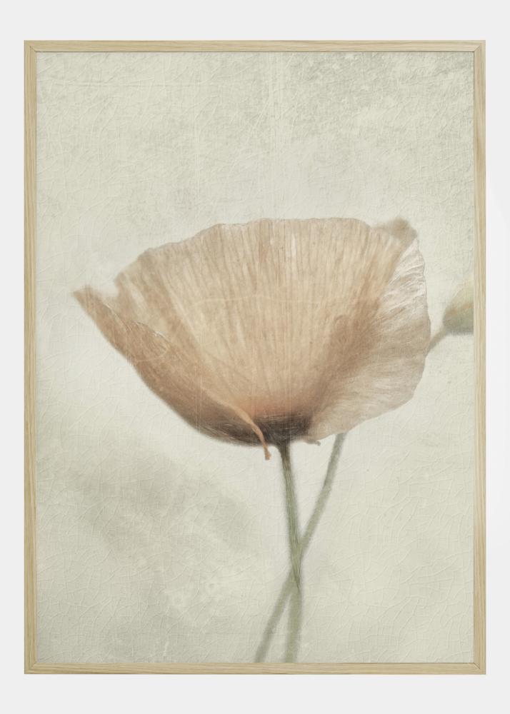 Ein schönes Naturporträt eines einzelnen pfirsichfarbenen Mohns auf beigefarbenen Hintergrund. Mit seinen weit geöffneten, zarten Blütenblättern vermittelt es ein Gefühl von Frieden und Ruhe. Die Transparenz der Blütenblätter zeigt das schwarze Herz der Blume. Ein aussagekräftiger Druck zum Aufhängen an einer hellen Wand.