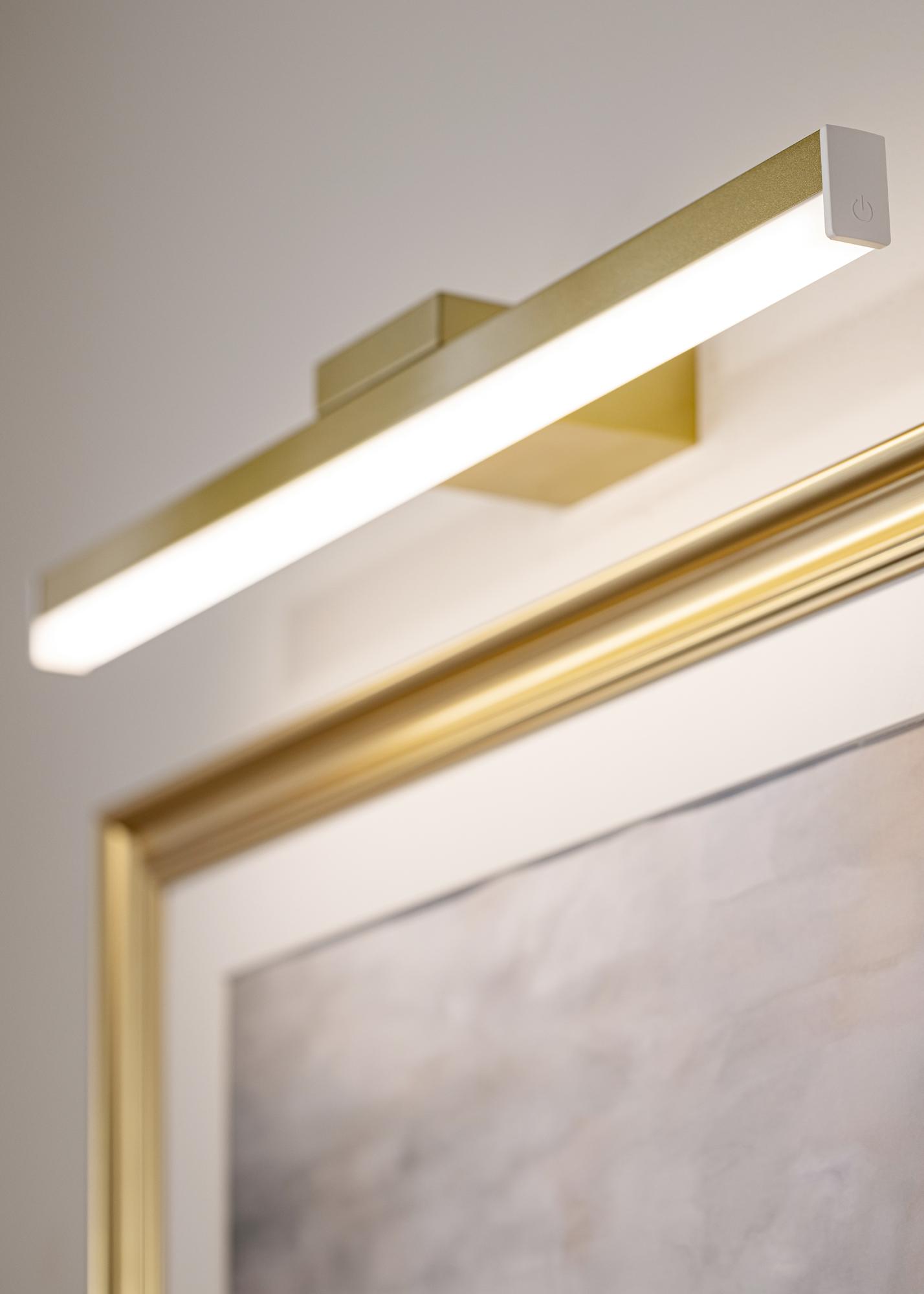 KAILA Glimmer ist eine elegante und batteriebetriebene Bilderbeleuchtung in Gold, entworfen, um Ihre Kunstwerke stilvoll hervorzuheben – ganz ohne Kabel. Die drahtlose Konstruktion macht es einfach, die Beleuchtung überall zu montieren, ohne auf Steckdosen achten zu müssen. Die raffinierte Goldoberfläche verleiht ein exklusives Gefühl, während das integrierte Licht für eine gleichmäßige und angenehme Beleuchtung sorgt. Einfach zu installieren und zu verwenden – eine perfekte Lösung, um Ihren Bildern die Aufmerksamkeit zu schenken, die sie verdienen.