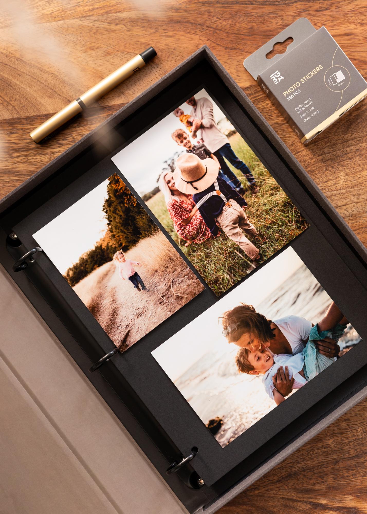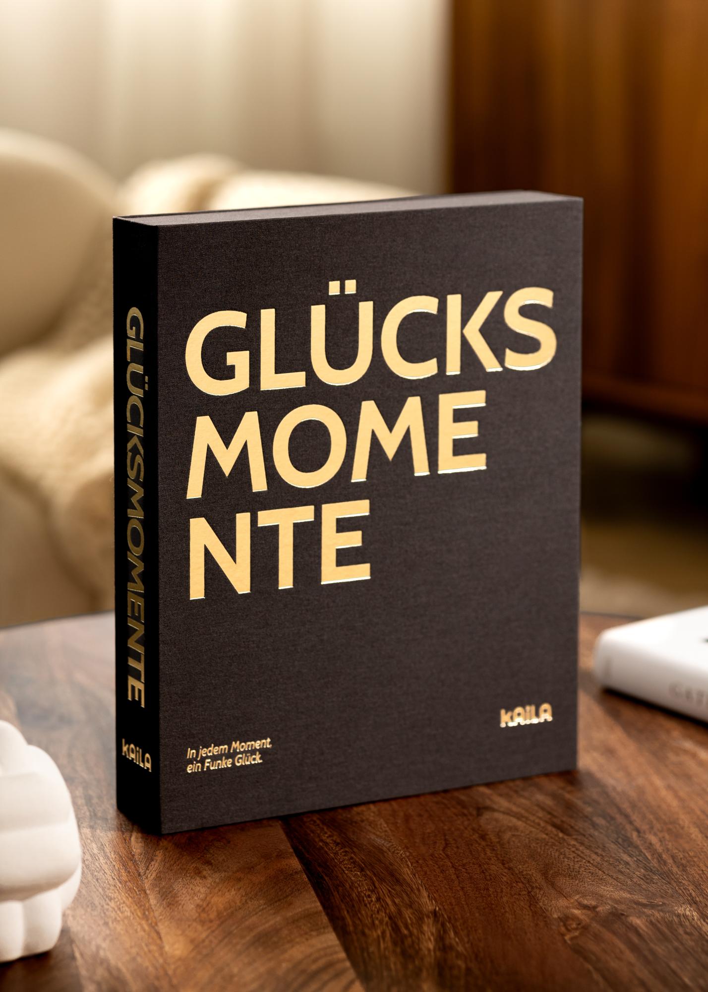 KAILA GLÜCKSMOMENTE Schwarz ist ein elegantes und stilvolles Fotoalbum, das als schönes Coffee Table Book gestaltet ist. Mit seinen beigen Einbänden und schwarzen Seiten wird dieses Album zu einem auffälligen Detail in Ihrem Zuhause, perfekt zum Herumliegen, damit sowohl Sie als auch Ihre Gäste darin blättern können.