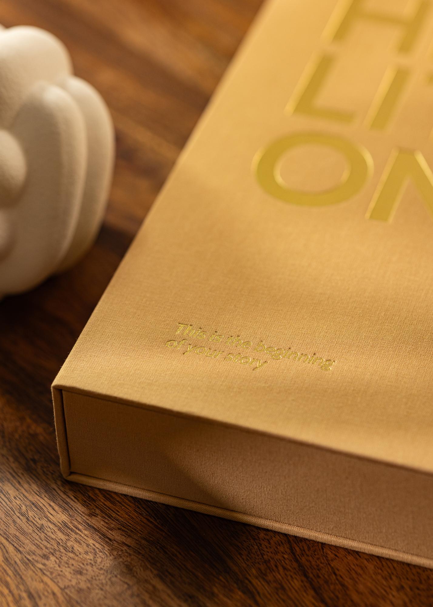 Bewahre deine allerliebsten Erinnerungen auf stilvolle Art und Weise in einem ausgesucht schönen Coffee Table Photo Album auf. Dieses wunderschöne Fotoalbum trägt den Titel "HI LITTLE ONE”, gedruckt in goldenen Großbuchstaben auf dem Deckblatt, sowie den Untertitel ”This is the beginning of your story”. Damit eignet sich dieses Fotoalbum perfekt für Babyfotos.