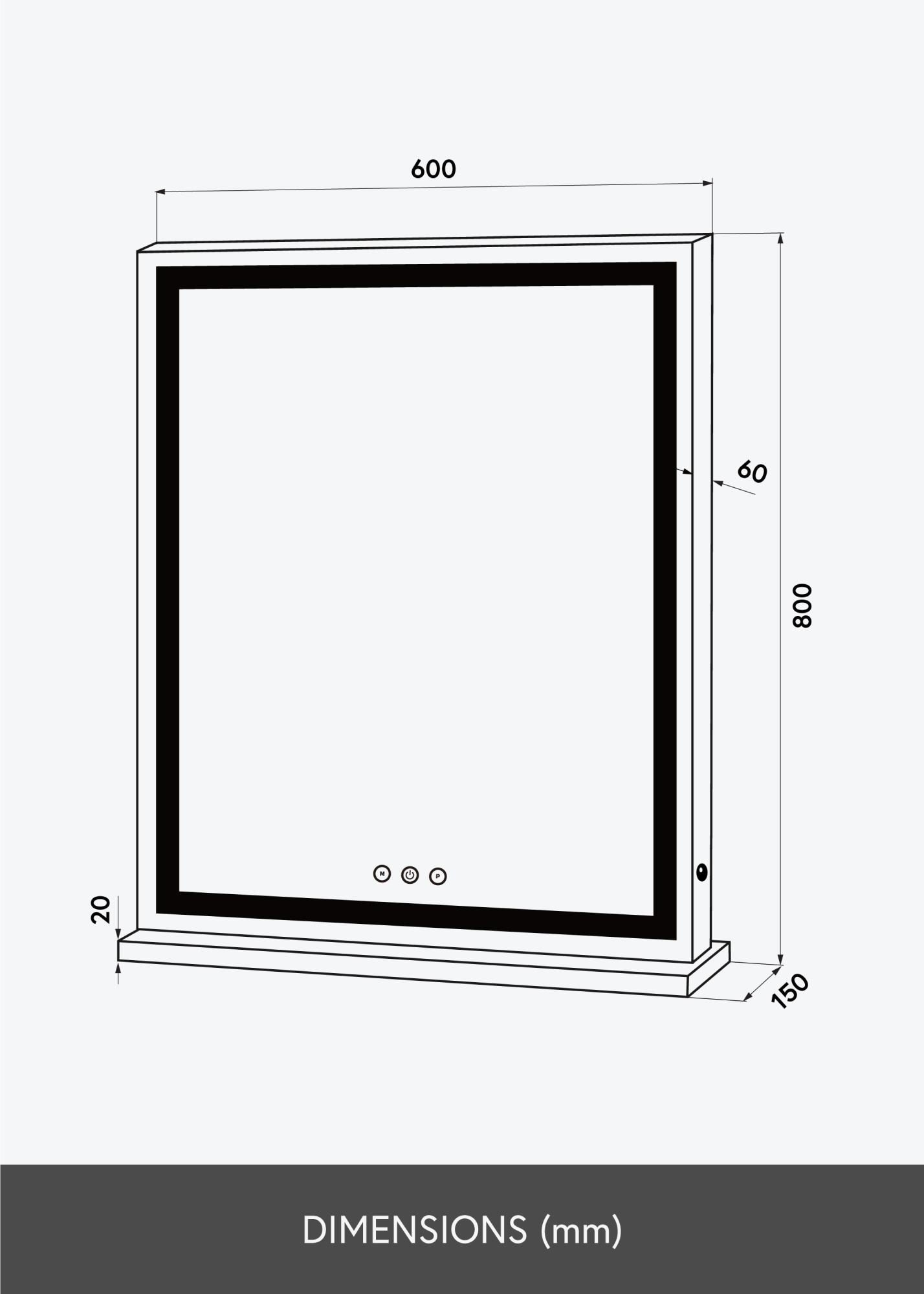 Am unteren Rand des Spiegels befinden sich drei Touch-Tasten – mit einer wird der Spiegel ein- oder ausgeschaltet und mit den anderen beiden kann die Beleuchtung eingestellt werden. Die mit ”M” markierte Taste dient der Auswahl der Farbtemperatur zwischen 3000K-6000K und mit der ”P”-Taste kann das Licht gedimmt, also die Lichtstärke eingestellt werden. So lässt sich die LED-Beleuchtung des Spiegels je nach Belieben, Bedarf und Situation anpassen.