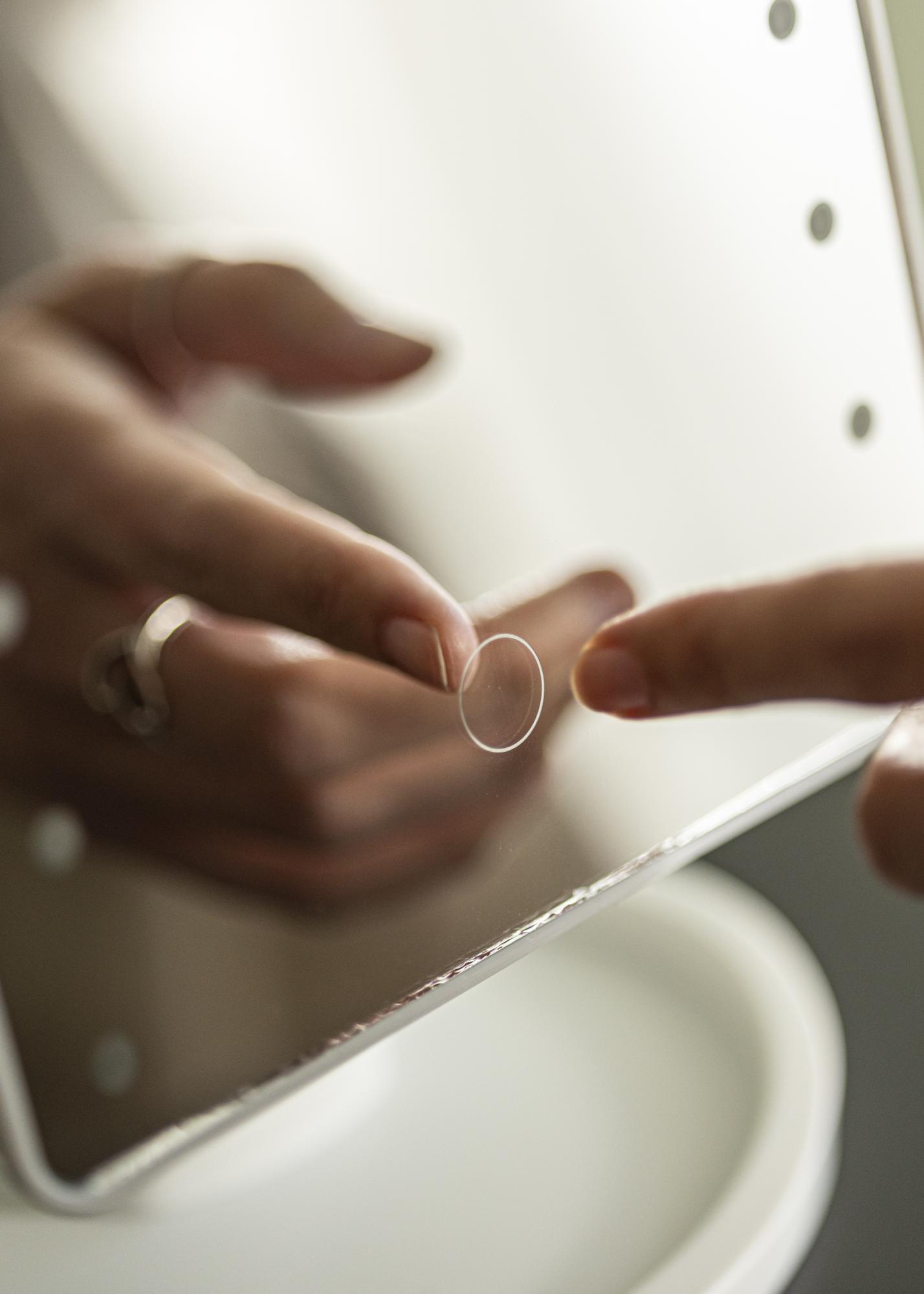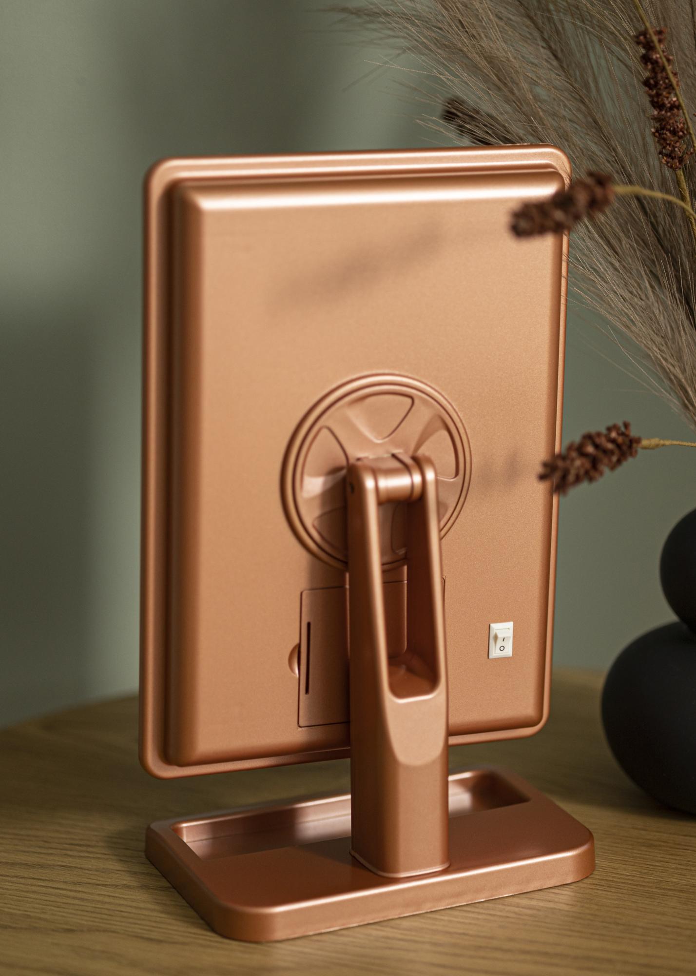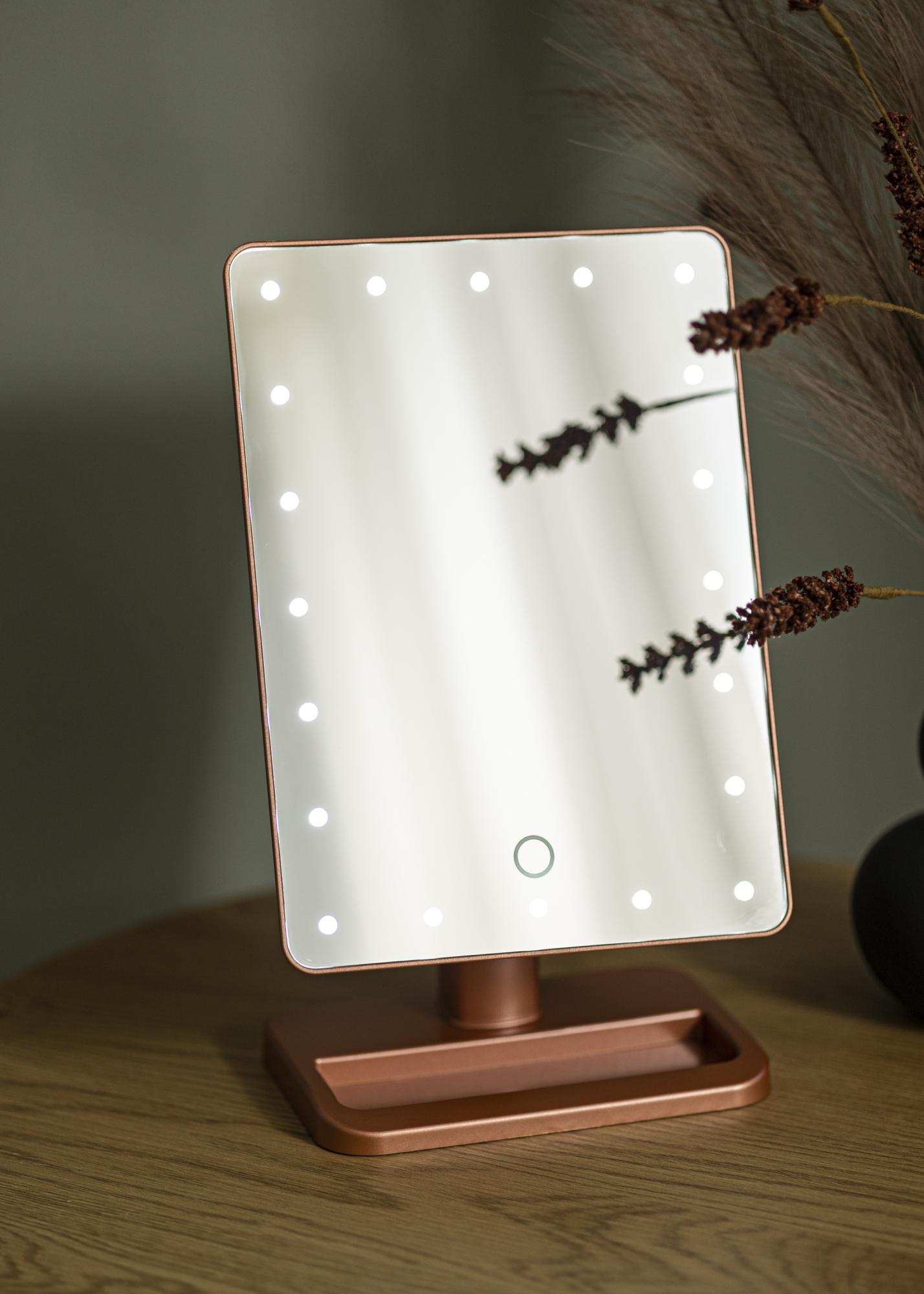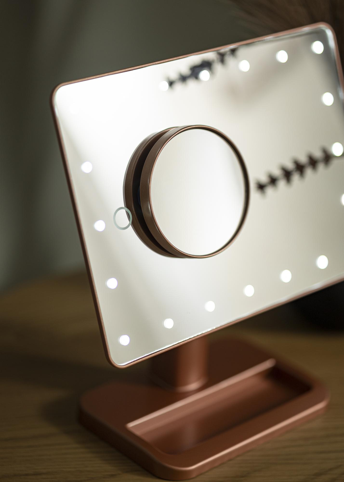 Dieser Make-Up Spiegel verfügt über eine integrierte LED-Beleuchtung, die per AN/AUS-Schalter auf der Rückseite eingeschaltet werden kann. Die LED-Beleuchtung mit der Farbtemperatur Kaltweiß ist dimmbar. Um die Lichtstärke einzustellen, wird einfach die Touch-Taste auf der Frontseite des Spiegels für einige Sekunden lang gedrückt. Dieser Spiegel mit Beleuchtung wird mit 4x AA-Batterien betrieben. Die Batterien sind nicht im Lieferumfang enthalten.