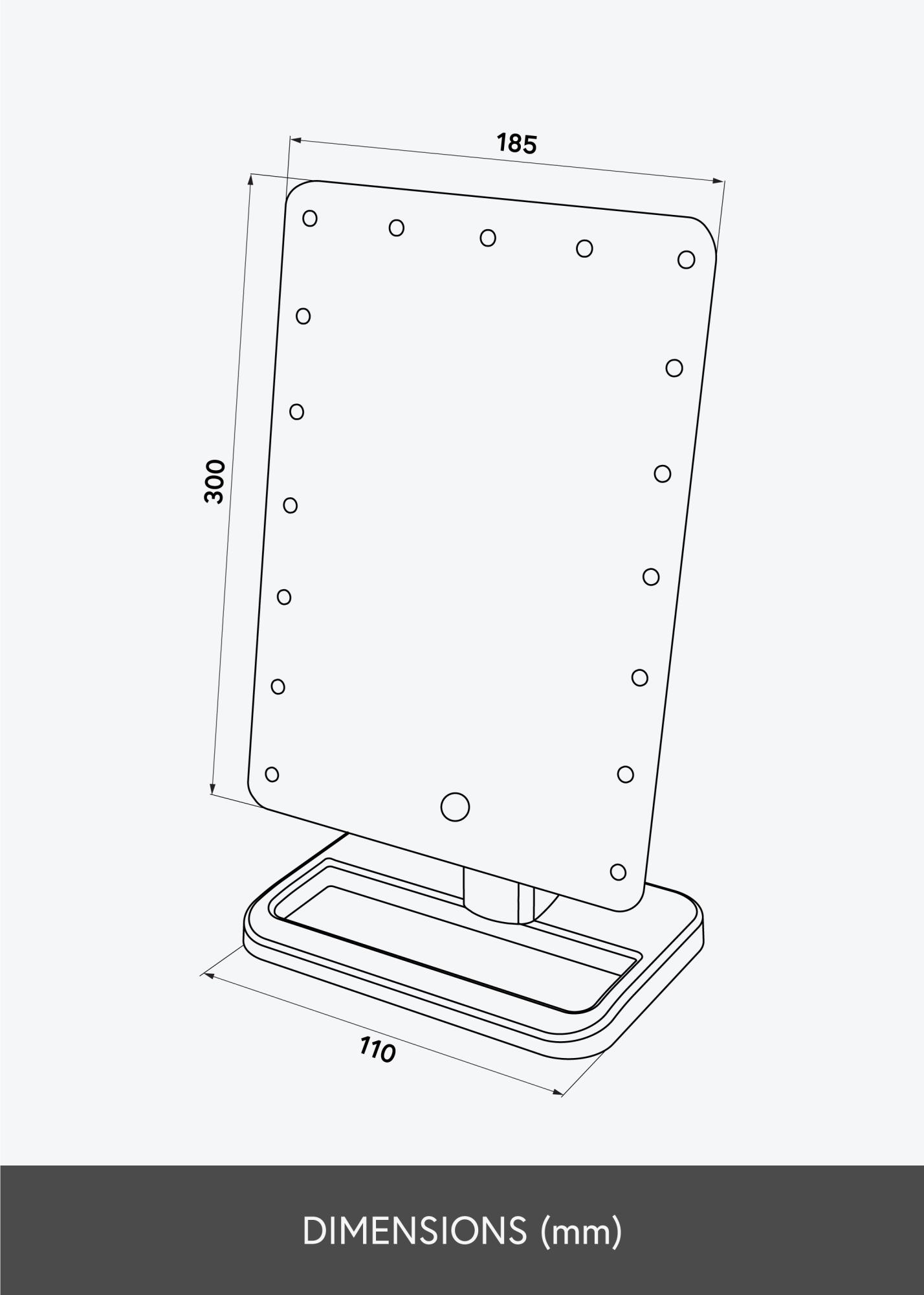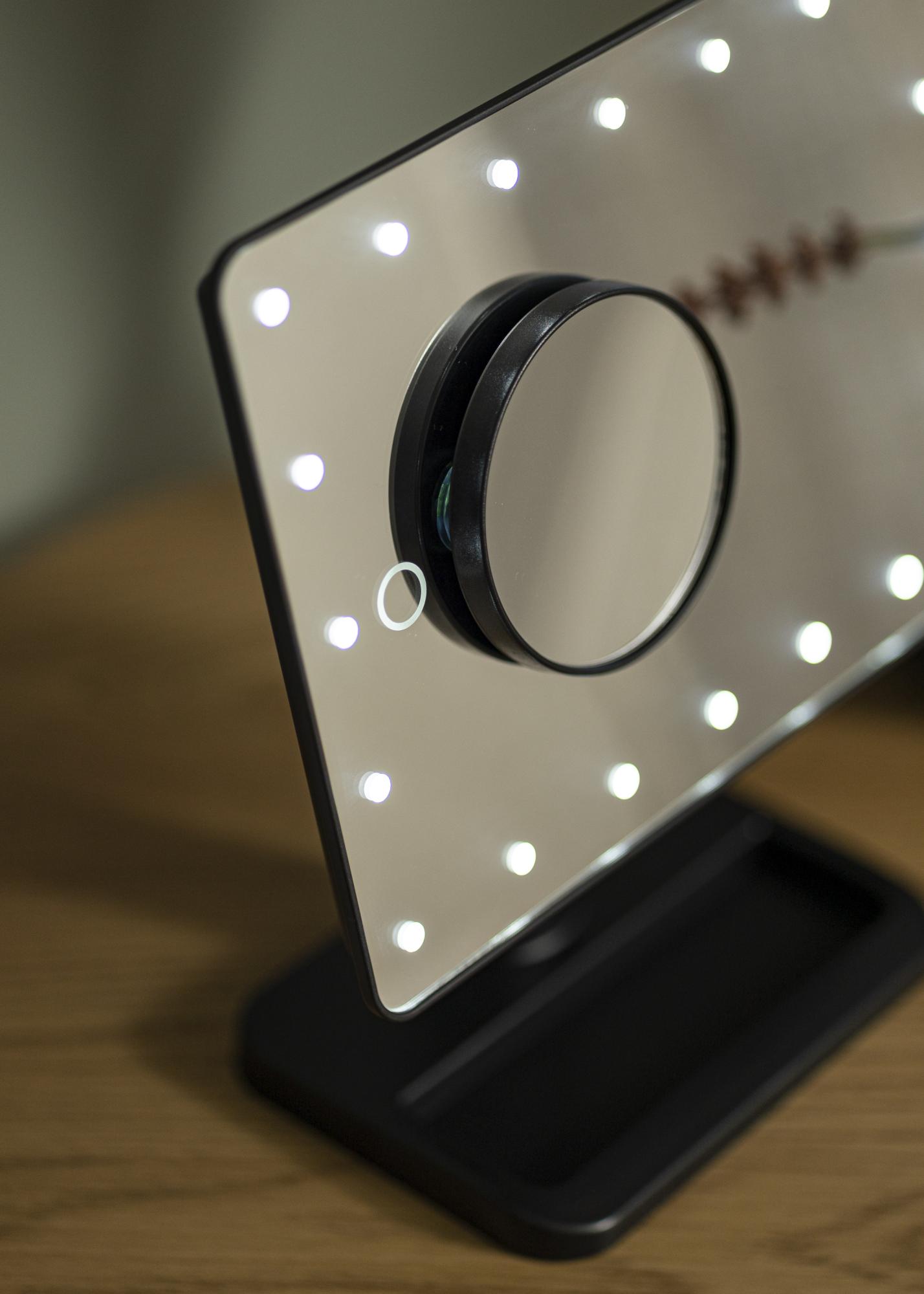 Dieser Make-Up Spiegel zeichnet sich durch sein ansprechendes und zugleich praktisches Design aus, denn er kann im Neigungswinkel verstellt werden. Außerdem ist im Lieferumfang dieses Kosmetikspiegels ein kleinerer Schminkspiegel mit 10-fach Vergrößerung enthalten, der entweder separat benutzt oder an der Spiegelfläche des großen Spiegels befestigt werden kann. Der Spiegel mit Beleuchtung wird mit 4x AA-Batterien betrieben. Die Batterien sind nicht im Lieferumfang enthalten.