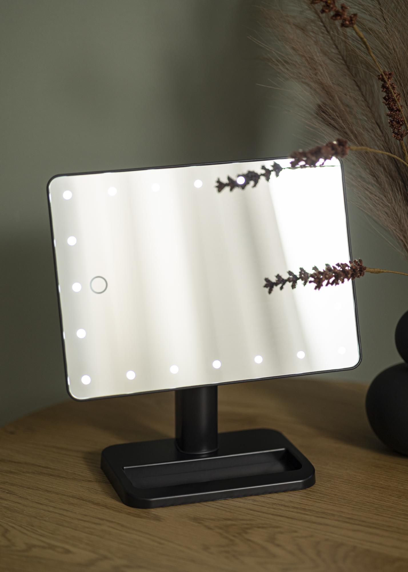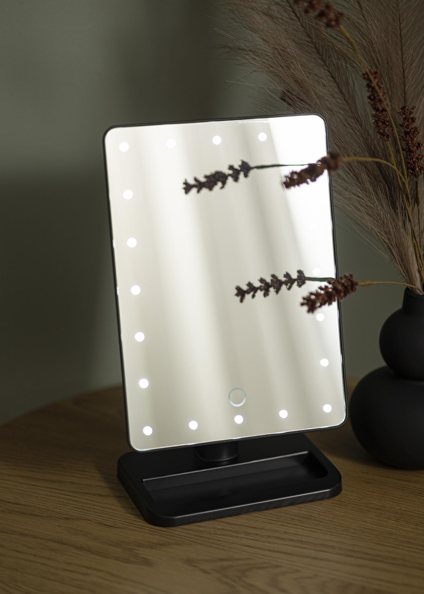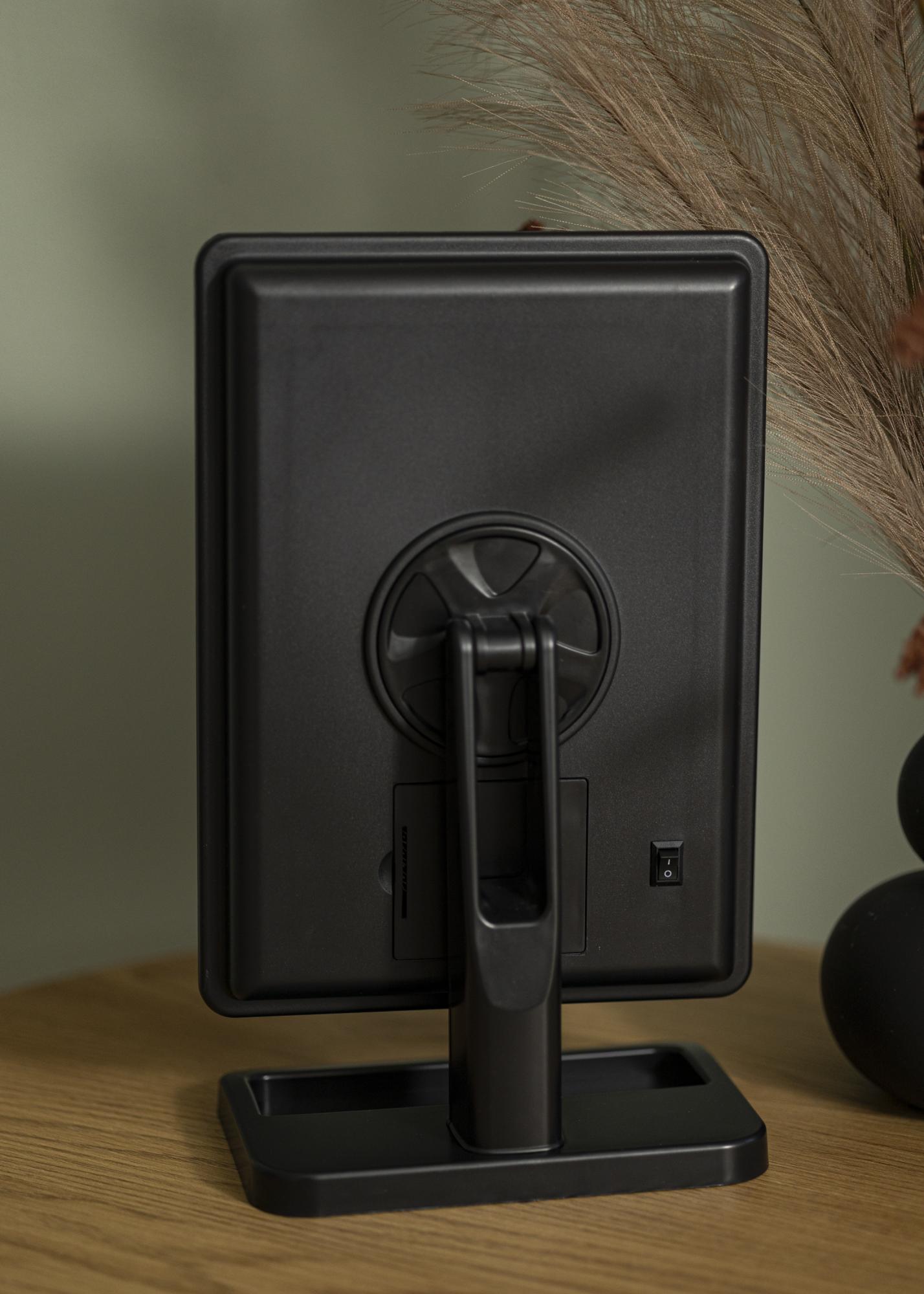 Kompaktes Design, Attraktivität und gleichmäßige Beleuchtung – der LED-Spiegel Foot Schwarz bietet alles, was ein Kosmetikspiegel mitbringen sollte. Die 16,5x25 cm große Spiegelfläche wird von LEDs hübsch eingerahmt. LED-Beleuchtung als Lichtquelle ist energiesparend und zeichnet sich in der Regel durch eine lange Lebensdauer aus. Auf der Rückseite des Schminkspiegels befindet sich der Schalter zum Einschalten der LED-Beleuchtung. Um die Lichtstärke des kaltweißen Lichtes einzustellen, wird einfach die Touch-Taste auf der Frontseite des Spiegels für einige Sekunden lang gedrückt.