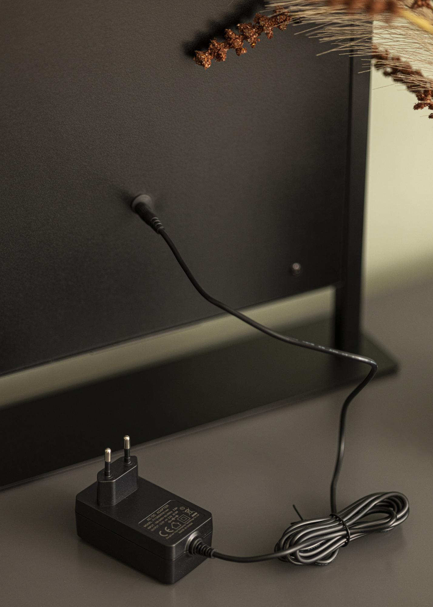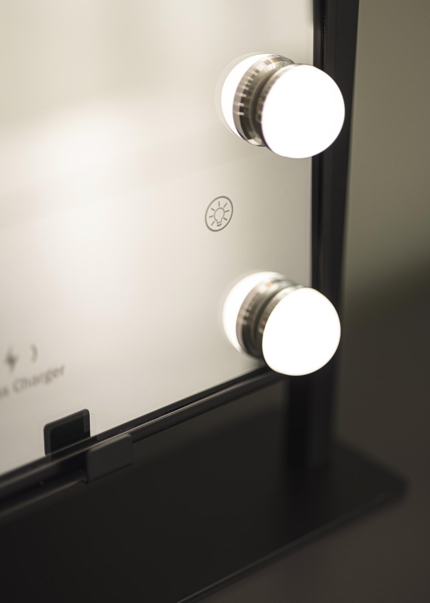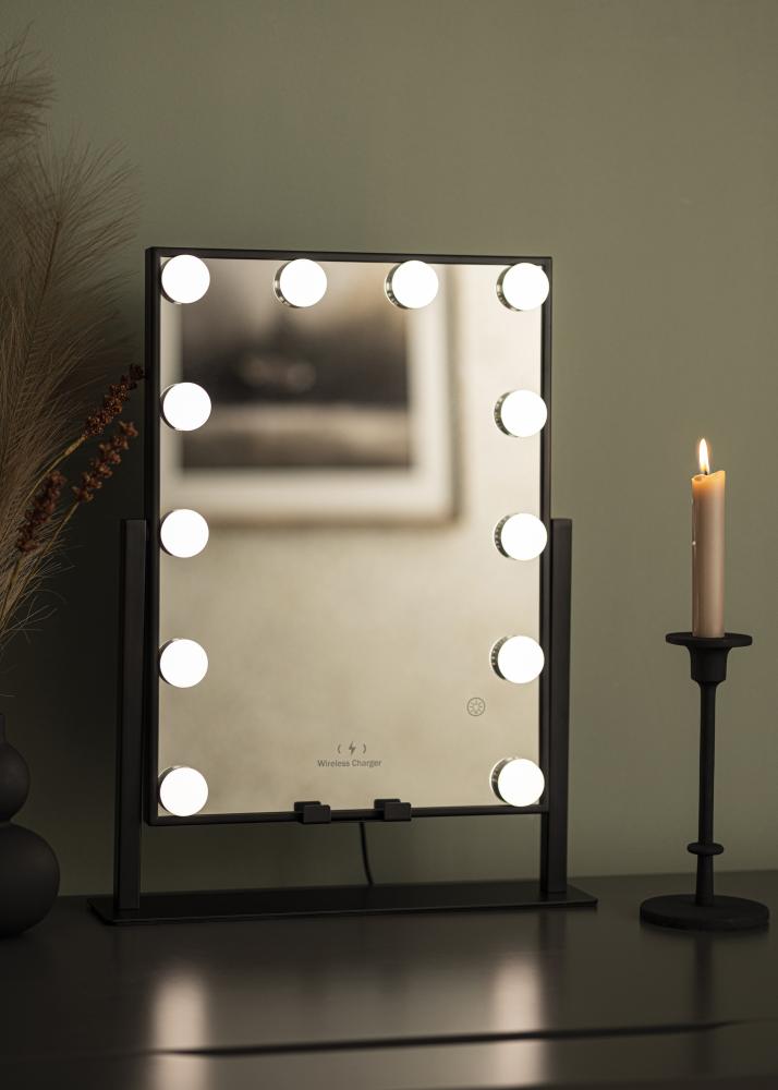 Der Spiegel mit Rahmen in stilsicherem Schwarz lässt sich prima in bestehende Wohneinrichtungen integrieren. Die neutrale Farbe des Spiegels wird mit 12 dekorativen LEDs ergänzt, die den eleganten, stilvollen Ausdruck dieses Hollywood Spiegels noch verstärken. Die integrierten LEDs verlaufen entlang der Kanten und rahmen die 30x41 cm große Spiegelfläche hübsch ein. Wird die Touch-Taste auf der Spiegelvorderseite für einige Sekunden lang gedrückt, kann gedimmt und so die gewünschte Lichtstärke eingestellt werden. Der Stromanschluss erfolgt über einen Stecker.