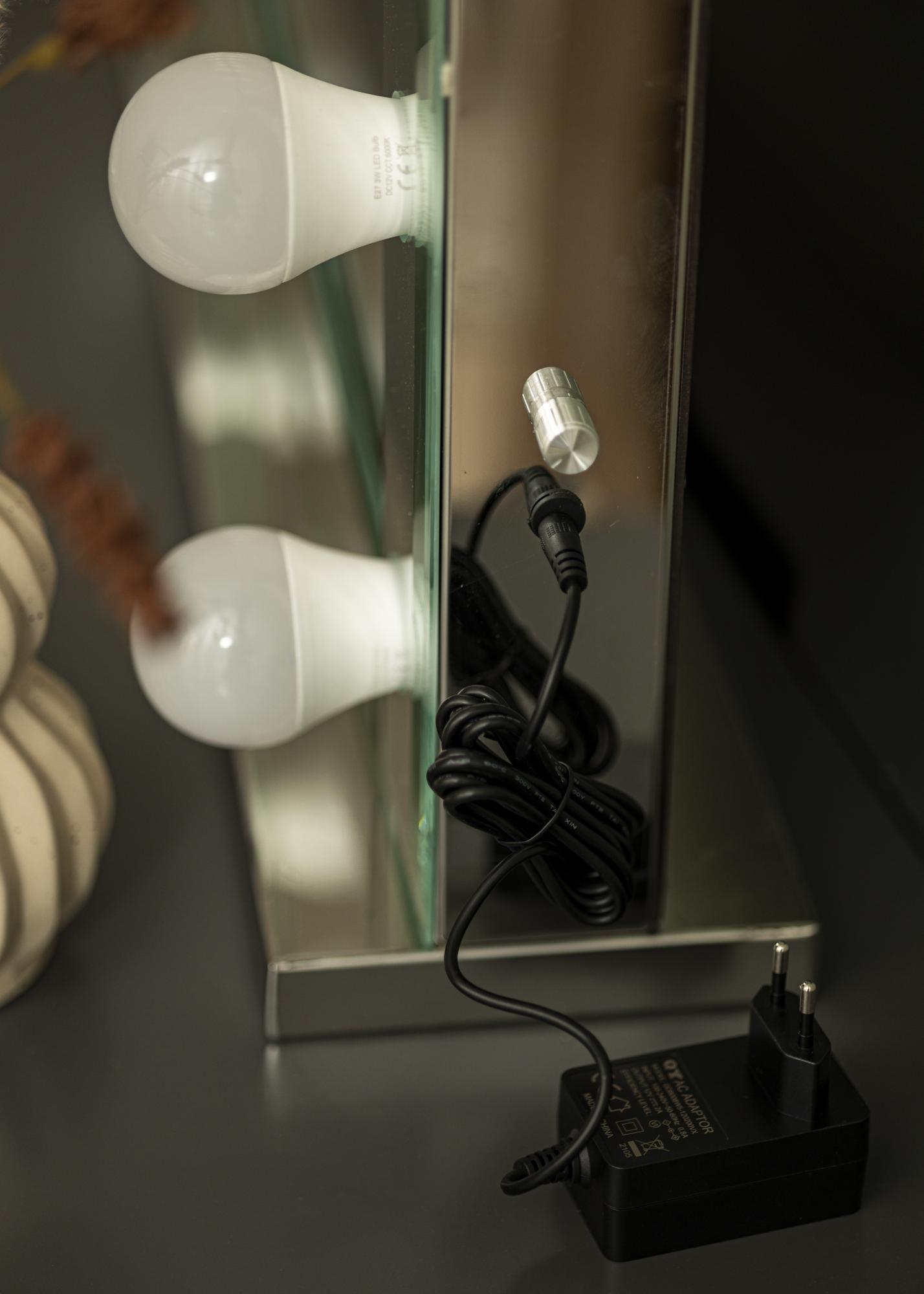 Verschönere dein Zuhause mit diesem Hollywood Make-Up Spiegel, einem Kosmetikspiegel in angesagtem, von Hollywood inspiriertem Design. Der Spiegel besitzt einen silberfarbenen Rahmen, der von 14 Glühlampen geschmückt wird, die dem Spiegel einen besonderen, luxuriösen Ausdruck verleihen. Die Leuchtmittel mit E27-Fassung können ausgetauscht werden, das Licht leuchtet mit kaltweißer Farbtemperatur. Die Beleuchtung ist dimmbar, sodass die Lichtstärke nach Belieben eingestellt werden kann. Beim Schminken und Auftragen von Make-Up ist ein helleres Licht vorteilhaft, wohingegen eine Hintergrundbeleuchtung gerne etwas gedimmt sein darf. Die Lichtstärke wird einfach mittels Drehschalter, der sich auf einer der kurzen Seiten des Spiegels befindet, eingestellt.