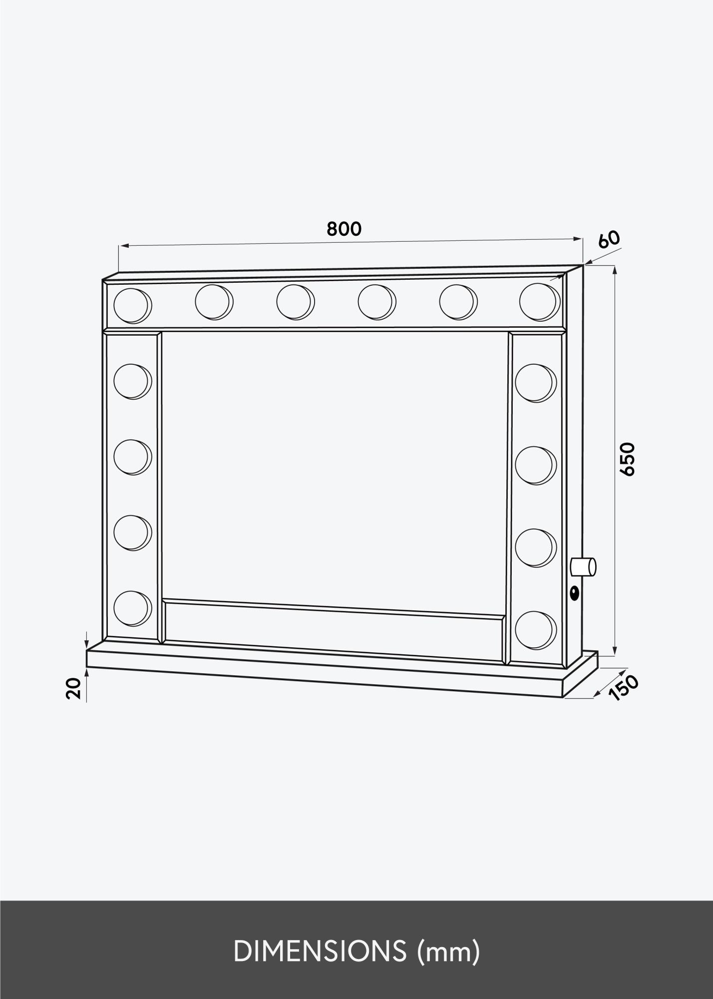 Dieser Hollywood Spiegel mit Beleuchtung hat mit der 80x65 cm großen Spiegelfläche ein großzügigeres Format. Der Ständer kann abgenommen werden, sodass dieser Spiegel mit Beleuchtung entweder aufgestellt oder an der Wand aufgehängt werden kann. Der Stromanschluss erfolgt über einen Stecker.