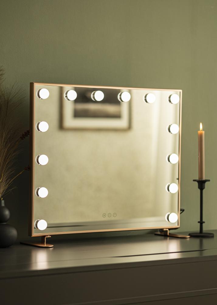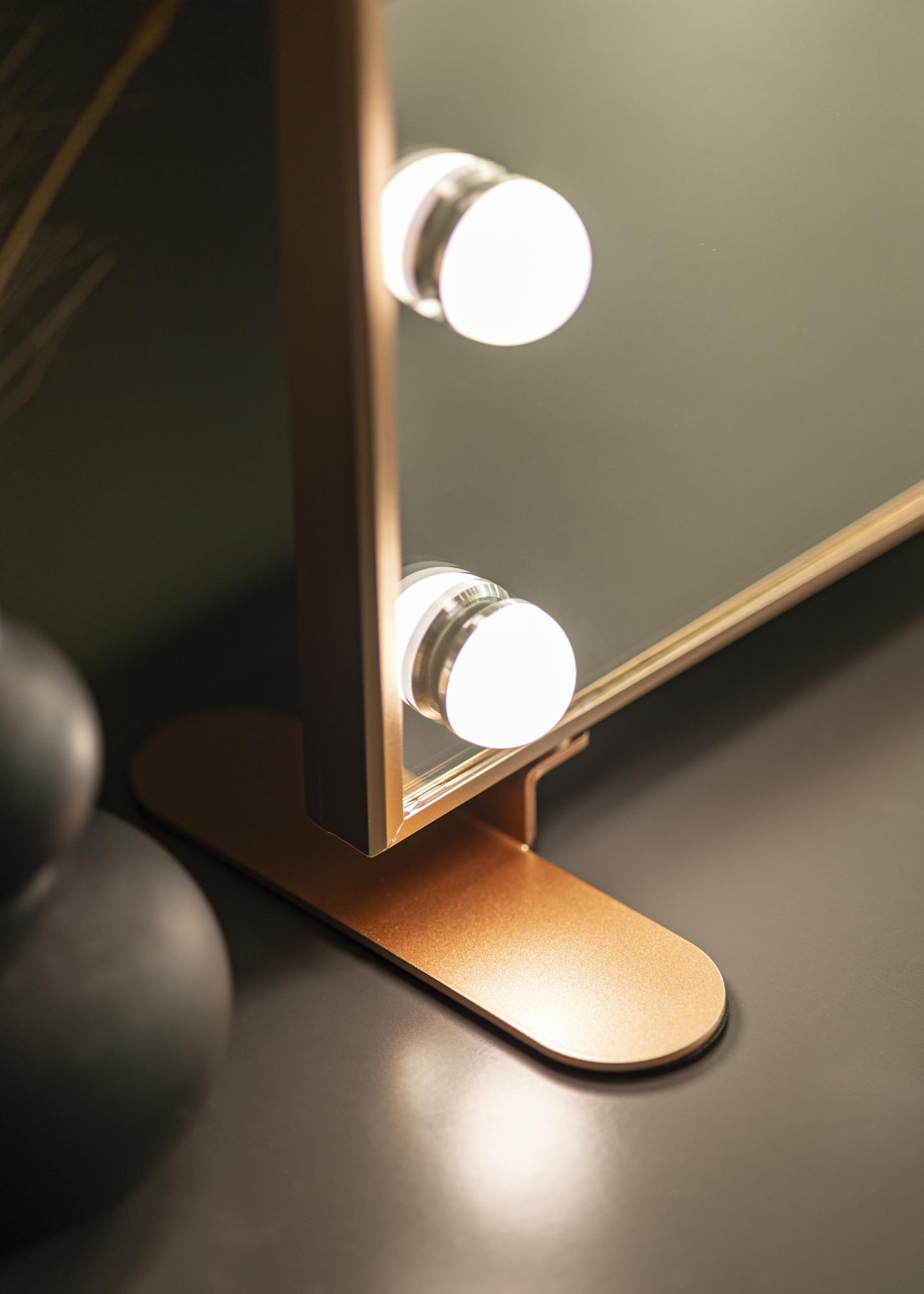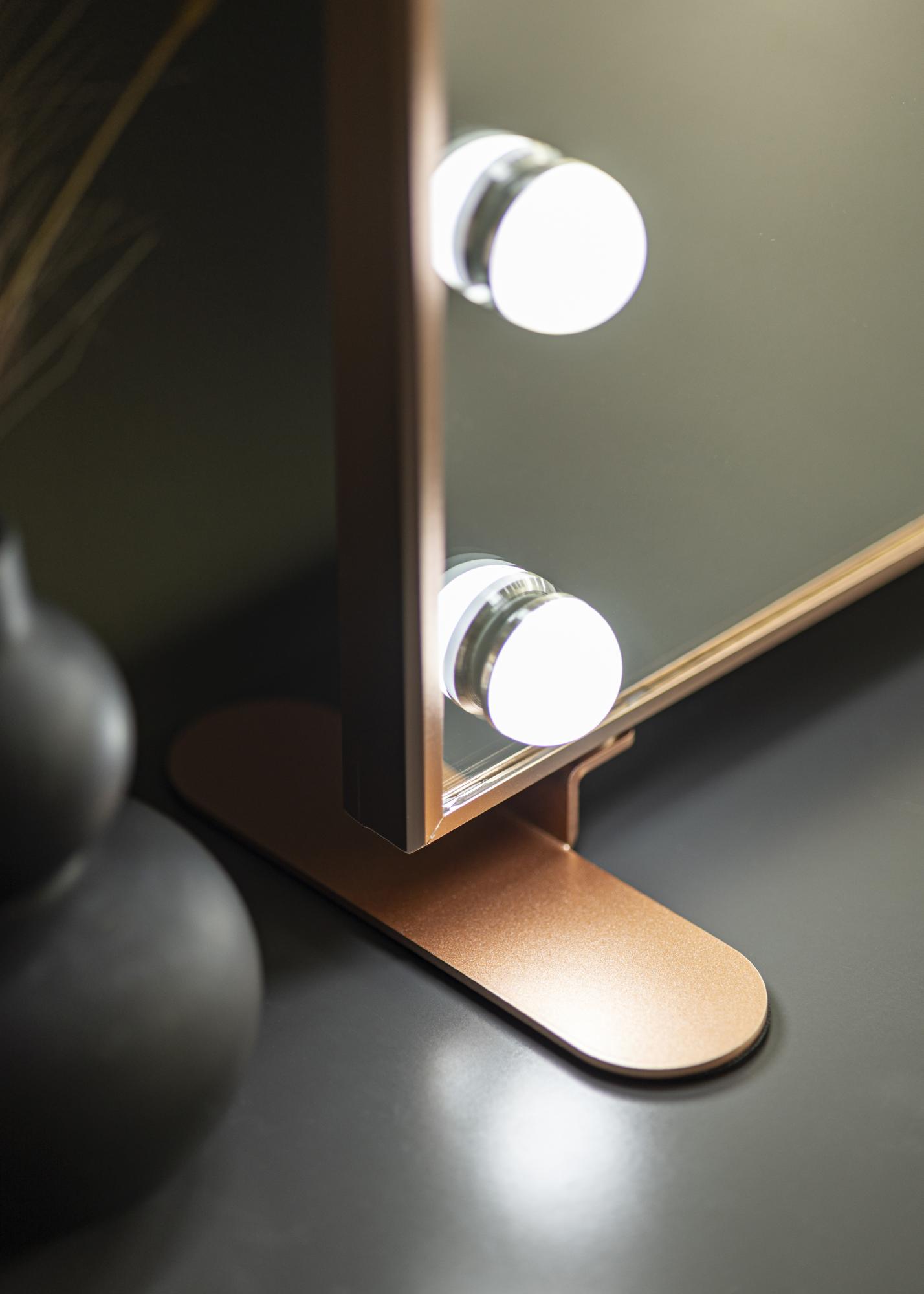 Dieser luxuriöse Kosmetikspiegel zeichnet sich durch seinen schmalen Metallrahmen in Roségold und seine LED-Beleuchtung in Form von 14 großen LED-Lampen aus. Damit erhält der Schminkspiegel sein glamouröses, von Hollywood inspiriertes Design, das mit dem eleganten, noblen Ausdruck ein besonderes Flair in den Raum bringt. Der schicke Ständer dieses Make-Up Spiegels, ebenfalls in Roségold gehalten, kann abgenommen werden, sodass der LED-Kosmetikspiegel auch als Wandspiegel genutzt werden kann. Auf einer Seite des Spiegels befindet sich ein USB-Port, sodass du deine smarten Endgeräte einfach via USB-Anschluss aufladen kannst.