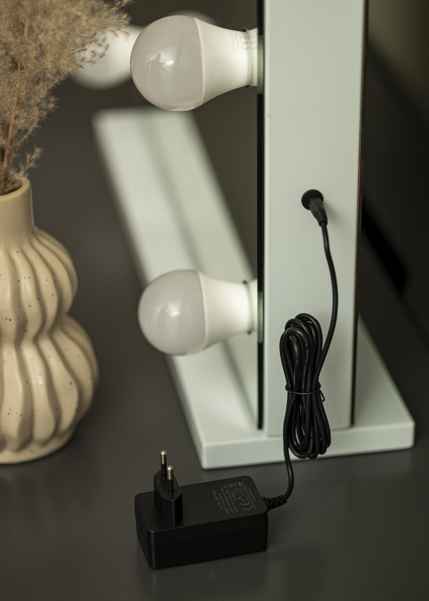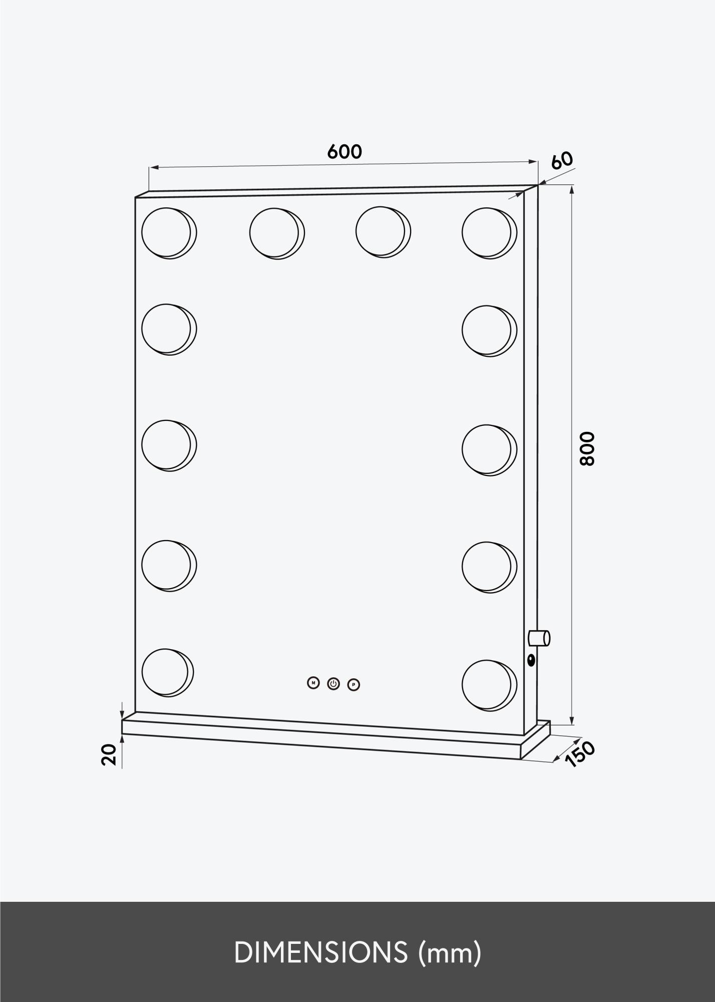Dieser Hollywood Spiegel in klassisch rechteckiger Form überzeugt durch seine große Spiegelfläche von 80x60 cm und 14 LED-Lampen, die den Spiegel elegant einrahmen. Der Make-Up Spiegel im Hollywood Design kann einfach aufgestellt werden, z.B. auf dem Schminktisch, einer Kommode oder einem Regal und stellt nicht nur einen tollen Blickfang, sondern auch ein funktionelles Wohnaccessoire dar. Hierfür einfach den Standfuß abmontieren und den Spiegel mit Hilfe der Halterungen auf der Rückseite des Spiegels an der Wand aufhängen. Der Stromanschluss erfolgt über einen Stecker.