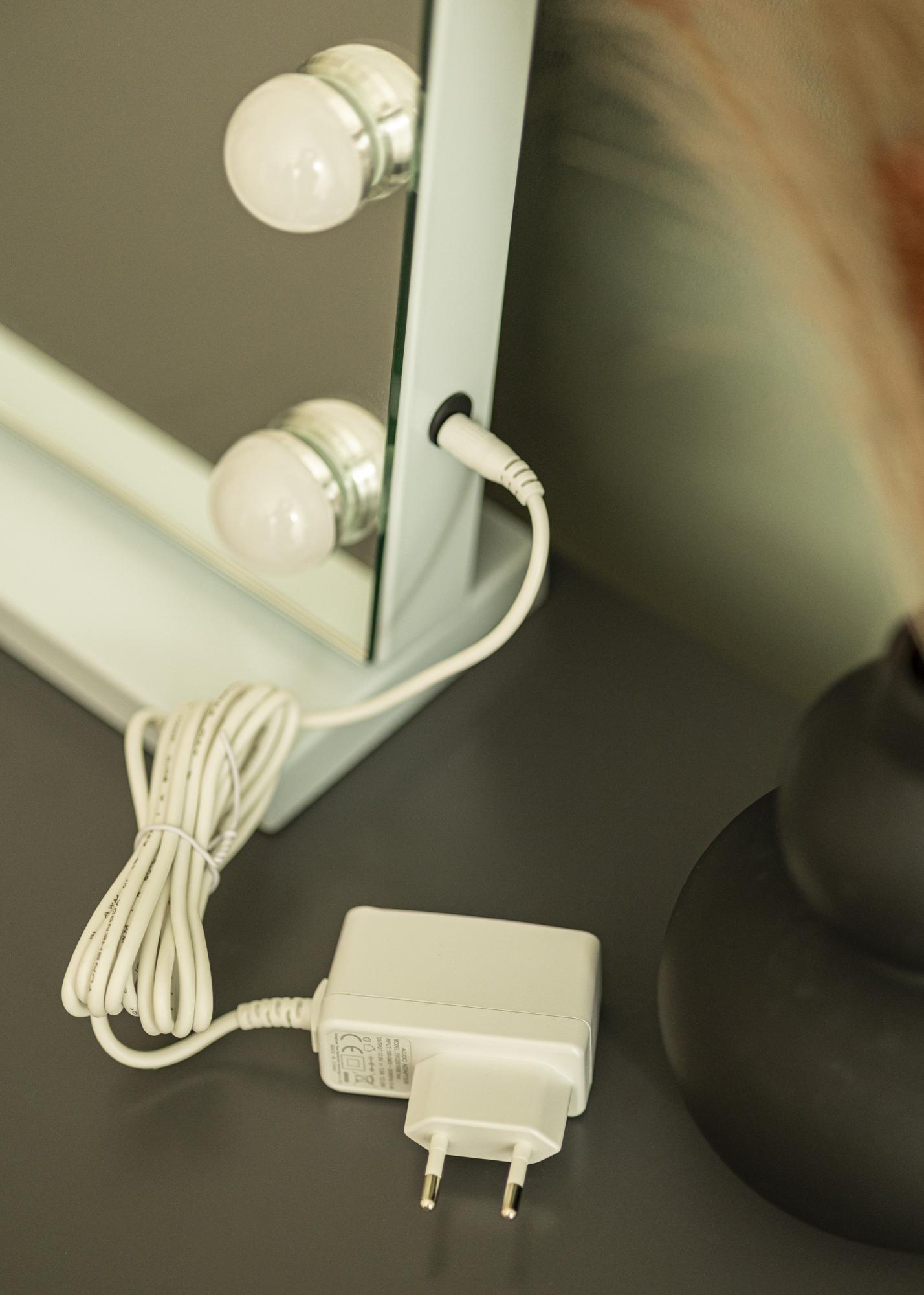 Der LED-Spiegel kann entweder waagerecht an die Wand gehängt oder mit Hilfe des Standfußes aufgestellt werden. Dieser Make-Up Spiegel verfügt über einen stilvollen weißen Standfuß, der dem gesamten Design eine zusätzliche Eleganz verleiht. Über einen Stecker wird der Spiegel mit integrierter Beleuchtung an den Strom angeschlossen.