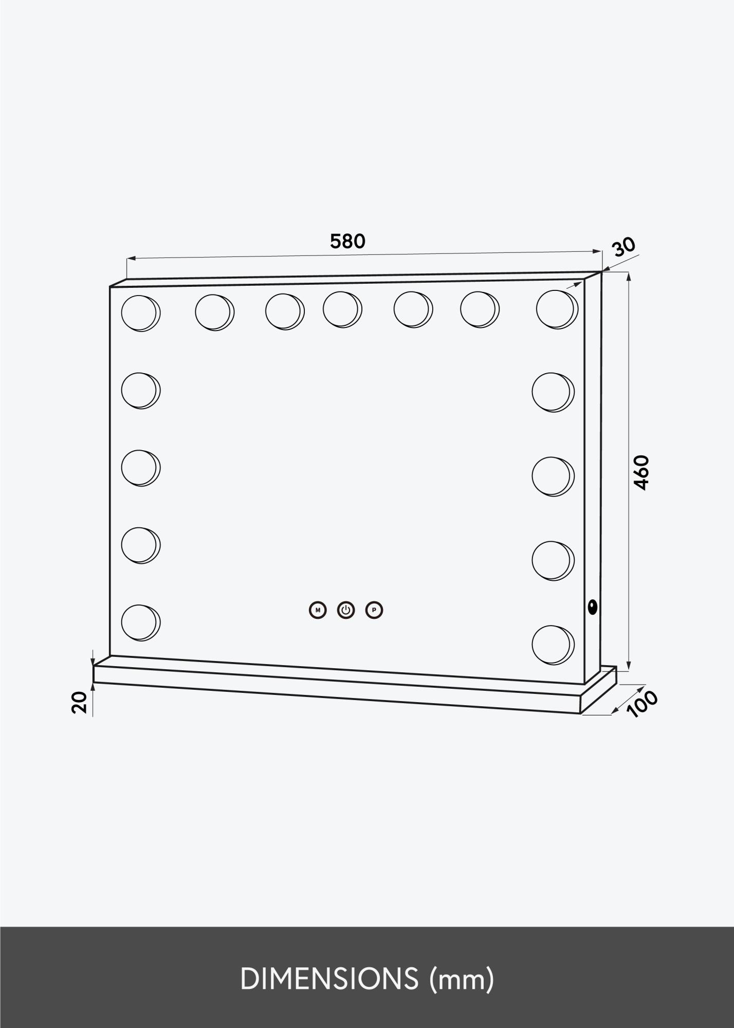 Mit diesem LED-Spiegel kannst du dir eine schöne, funktionelle Schminkecke einrichten. Der Kosmetikspiegel macht mit seiner stilsicheren rechteckigen Form und der eingebauten LED-Beleuchtung mit gleichmäßigem Lichtschein als funktionelles und zugleich dekoratives Wohnaccessoire überall eine tolle Figur. Das hübsche Design dieses Spiegels mit LED-Beleuchtung lässt sich auch wunderbar in Wohnzimmer oder Flur integrieren und kann nicht nur als Spiegel, sondern auch als stimmungsvolle Hintergrundbeleuchtung seinen Zweck erfüllen. Die dimmbare Beleuchtung dieses Spiegels besteht aus 15 LED-Lampen, welche die 58x46 cm große Spiegelfläche einrahmen. Die Beleuchtung kann mittels Touch-Taste auf der Vorderseite des Spiegels schnell und einfach gedimmt werden. Die Touch-Tasten sind mit Buchstaben gekennzeichnet – mit einem "P" für die Einstellung der Lichtstärke und mit einem "M" für die Wahl der Farbtemperatur bzw. der Lichtfarbe.