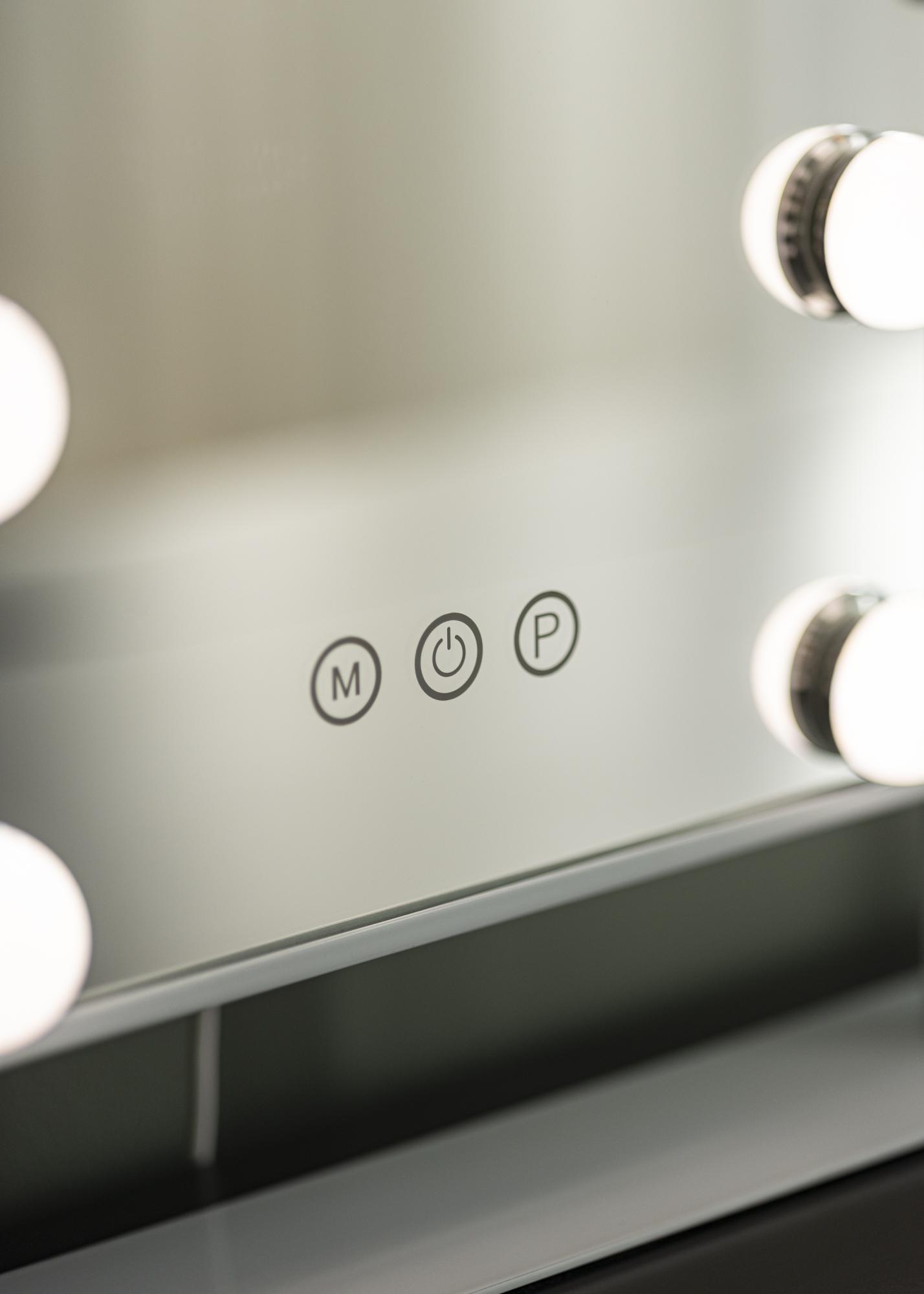 Via Touch-Feld auf der Frontseite des Spiegels wird die Beleuchtung des LED-Spiegels schnell und einfach aktiviert. Dort befinden sich auch Touch-Tasten zum Einstellen von Lichtstärke und Farbtemperatur. Die mit einem ”M” gekennzeichnete Taste dient zur Wahl der Farbtemperatur und die „P“-Taste zum Einstellen der Lichtstärke. Der Stromanschluss erfolgt über einen Stecker.