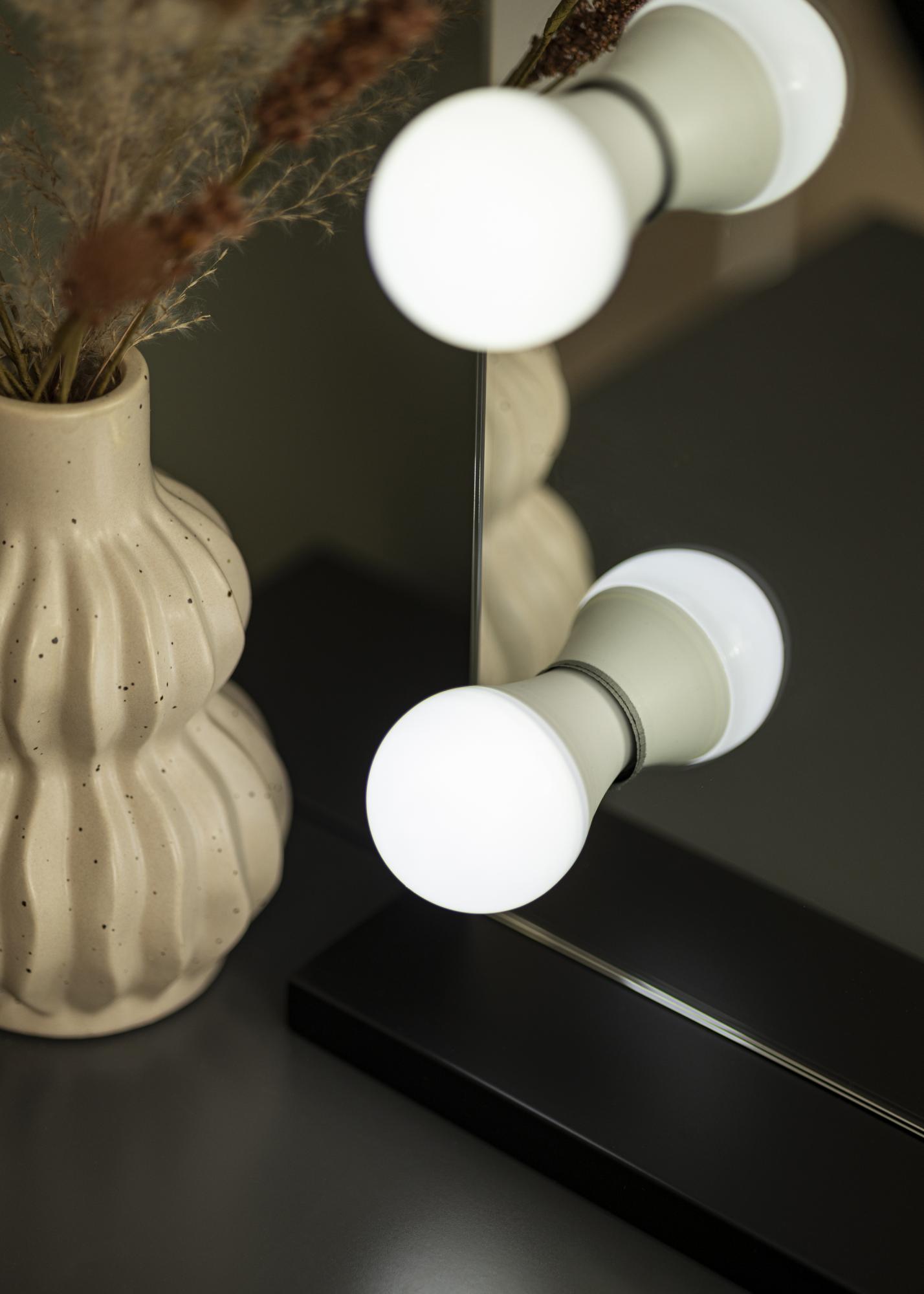 15 austauschbare Lampen rahmen den Spiegel ein