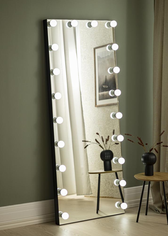 Dieser Ganzkörperspiegel ist dank seines von Hollywood inspirierten Designs mit LED-Glühlampen, die wie ein Rahmen um die Spiegelfläche verlaufen, ein echter Blickfang in Flur, Schlafzimmer oder Ankleideraum. Mit den großzügigen Maßen dieses Garderobenspiegels und seiner Spiegelfläche von 72x180 cm ist dieser große LED-Spiegel optimal, um dich in voller Größe darin zu spiegeln. Ein dekorativer Ankleidespiegel, der als Standspiegel ein funktioneller Einrichtungsgegenstand und nützlich beim Ankleiden, der Auswahl der Kleider, ist. Der Spiegel wird hochkant stehend aufgestellt und an der Wand befestigt.