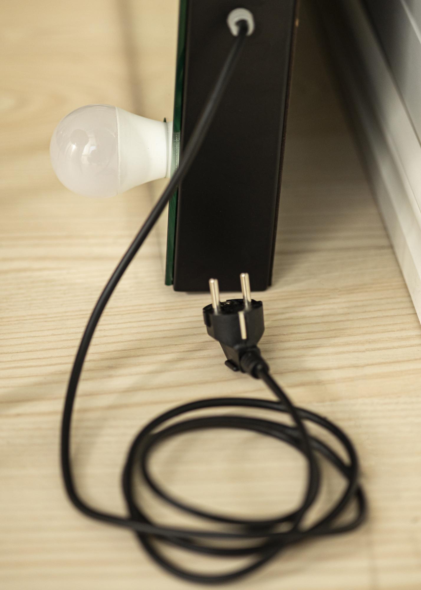 Dieser Standspiegel ist mit integrierter Beleuchtung in Form von 20 LED-Glühlampen ausgestattet, die ein kaltweißes Licht abgeben. Die Glühlampen mit E27-Fassung sind austauschbar, können also nach Bedarf ausgewechselt werden. Die LED-Beleuchtung ist dimmbar, sodass du die gewünschte Lichtstärke durch den kleinen Drehregler an der Spiegelkante selbst einstellen kannst. Der Stromanschluss erfolgt über einen Stecker.