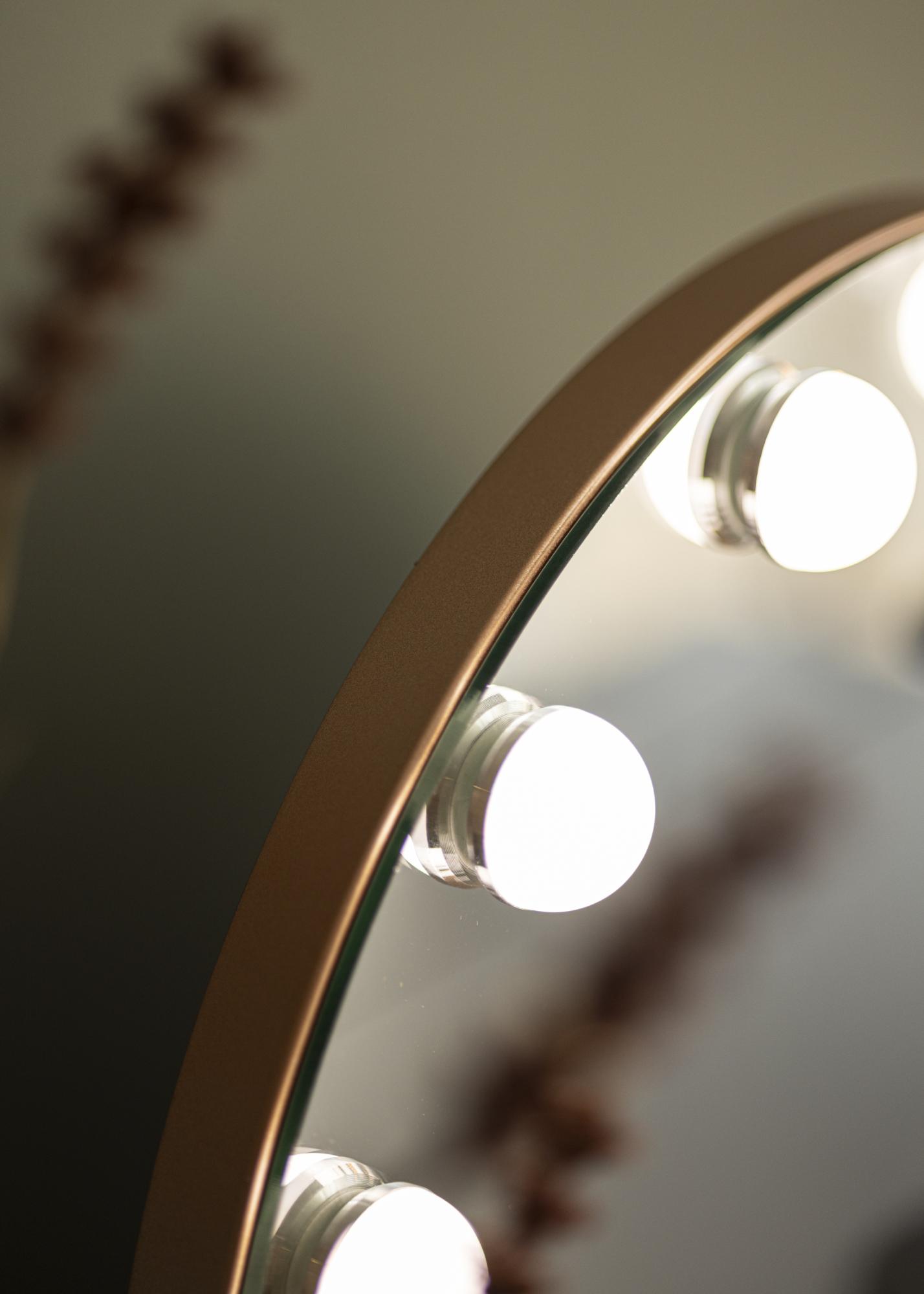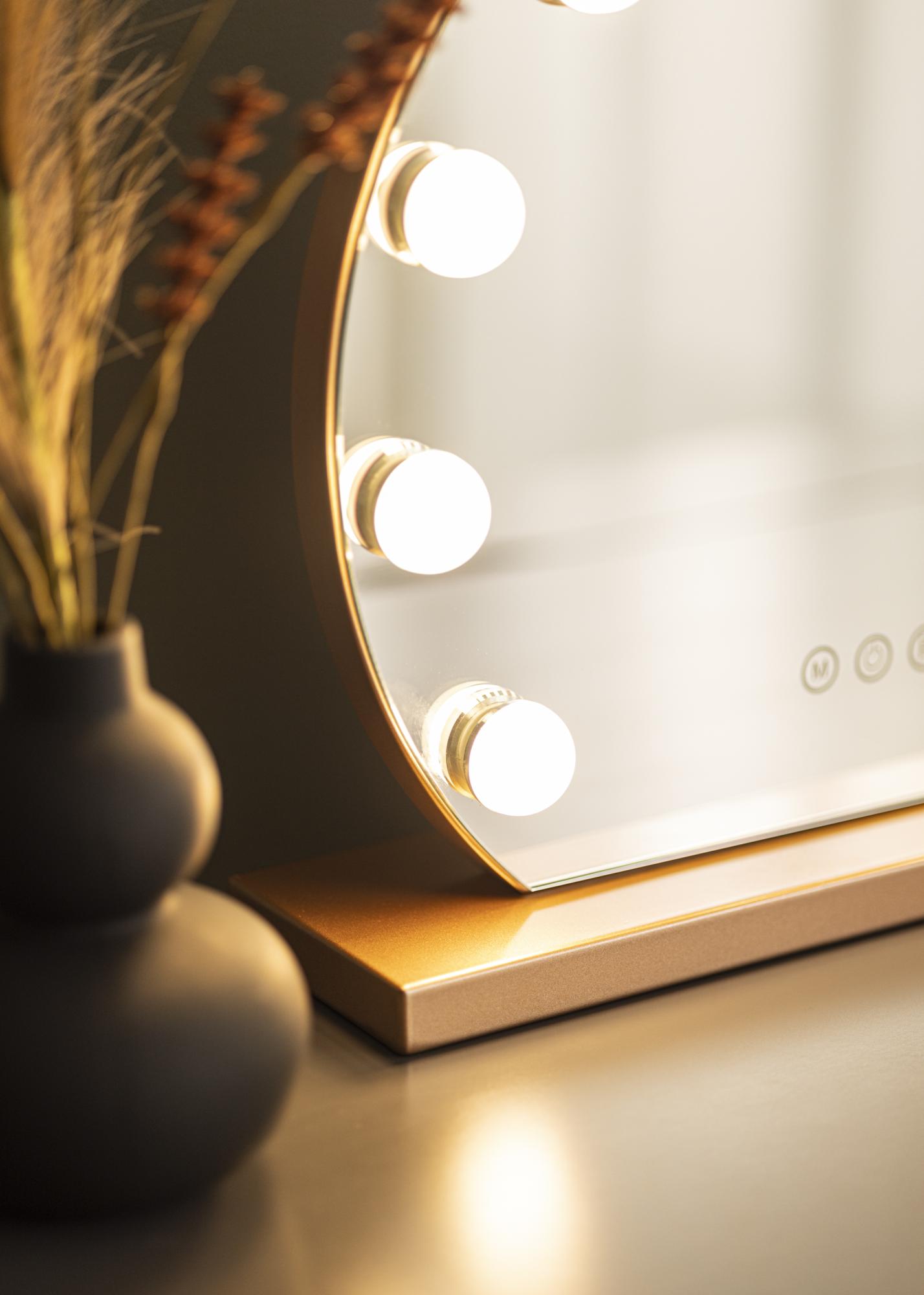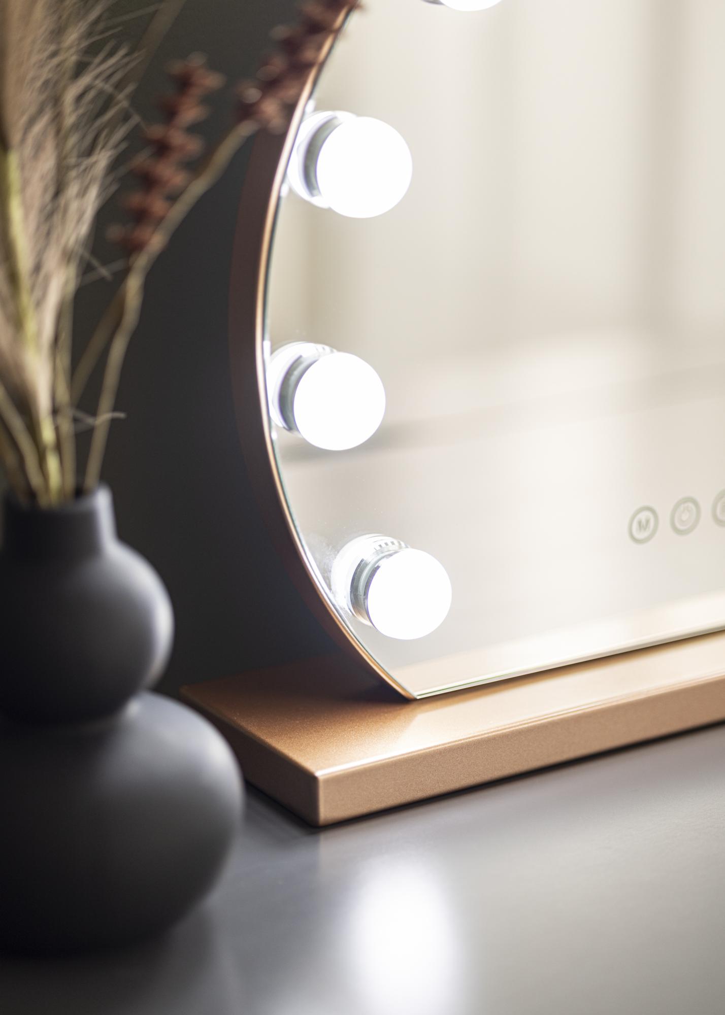 Dieser Hollywood Make-Up Spiegel zeichnet sich durch seine klassisch runde Form und die 10 großen LEDs, die die 40x30 cm große Spiegelfläche einrahmen, aus. Dadurch erhält dieser hübsche Hollywood Spiegel sein exklusiv und luxuriös wirkendes Design, das vom Ständer des Spiegels, der in einer trendigen, roségoldenen Farbnuance gehalten ist, zusätzlich betont wird. Die integrierte Beleuchtung des Make-Up Spiegels wird über eine Touch-Taste an der Vorderseite des Spiegels eingeschaltet. Farbtemperatur und Lichtstärke können nach Belieben eingestellt werden. Auch dafür gibt es praktische Touch-Tasten: Die mit einem "M" gekennzeichnete Taste dient zur Einstellung der Farbtemperatur und mit der "P"-Taste kann die Lichtstärke eingestellt werden. Es kann zwischen warmweißer, kaltweißer und natürlicher Lichtfarbe ausgewählt werden.