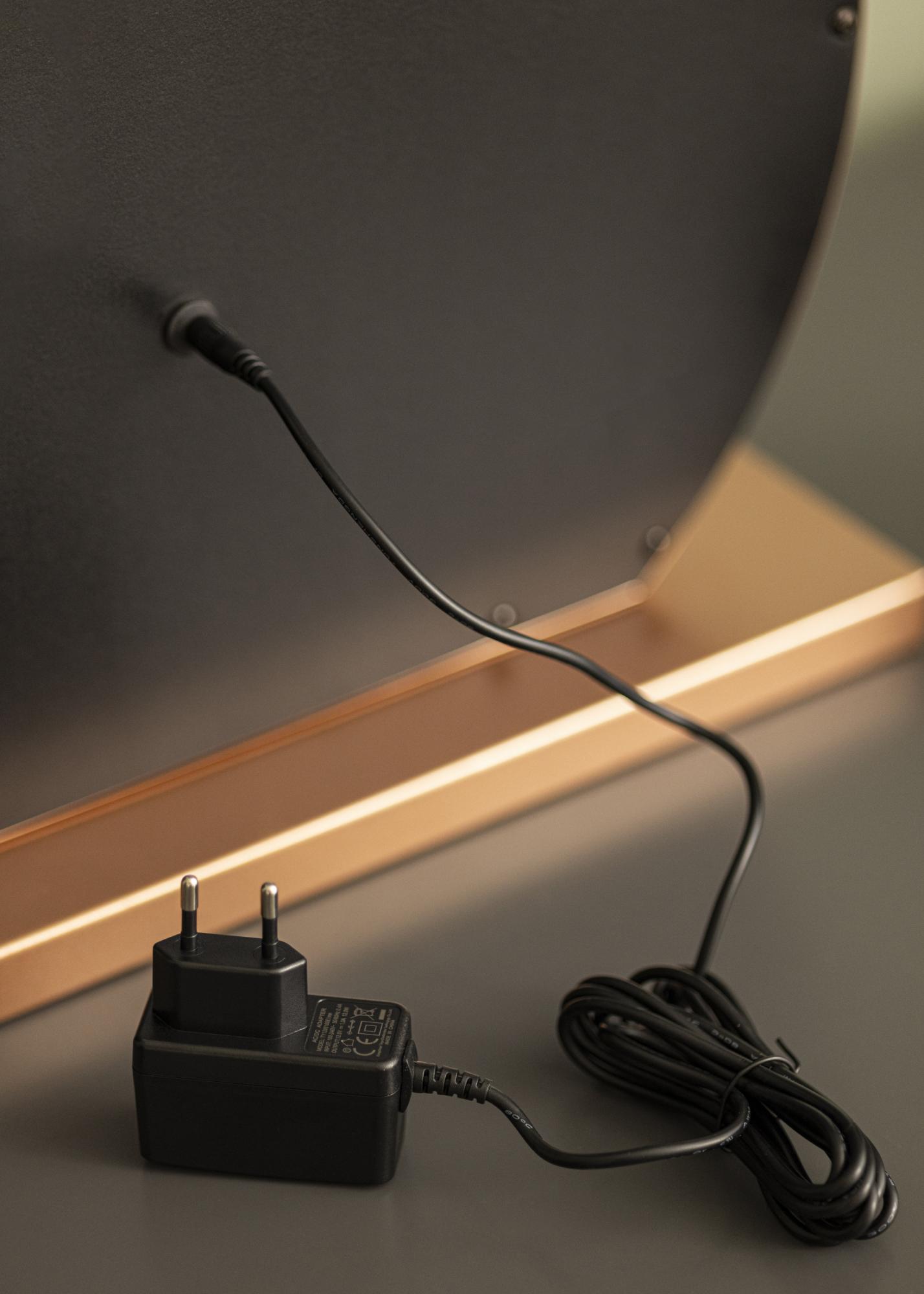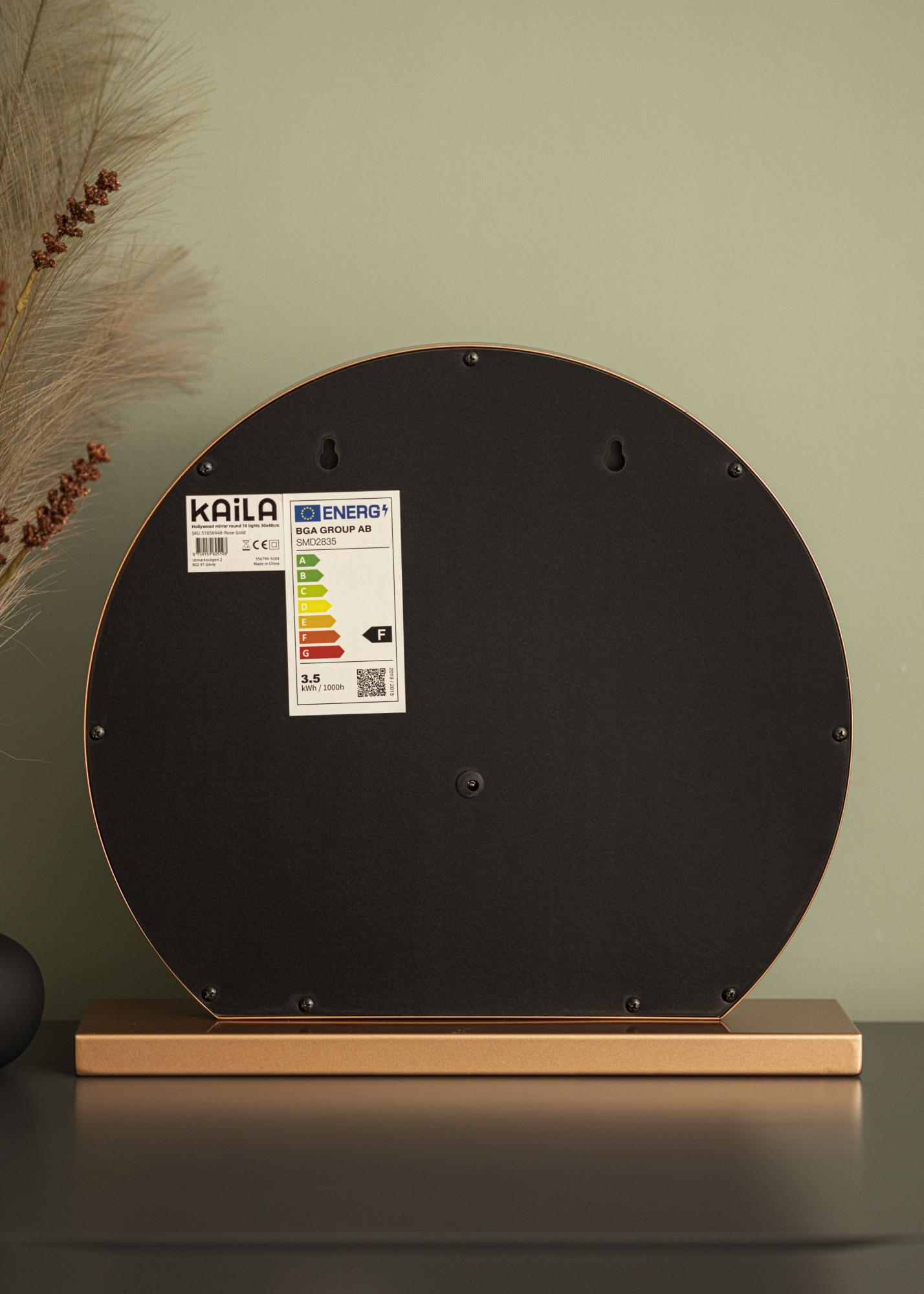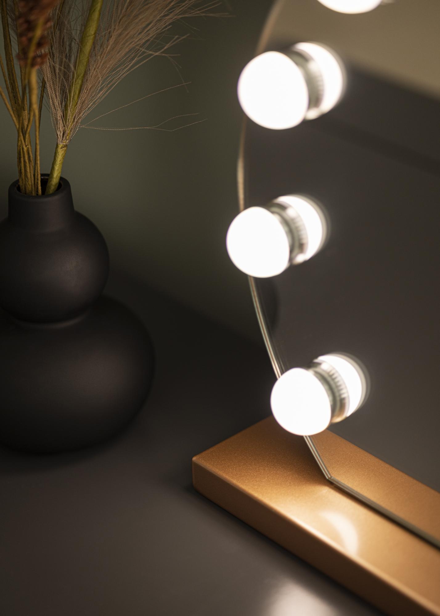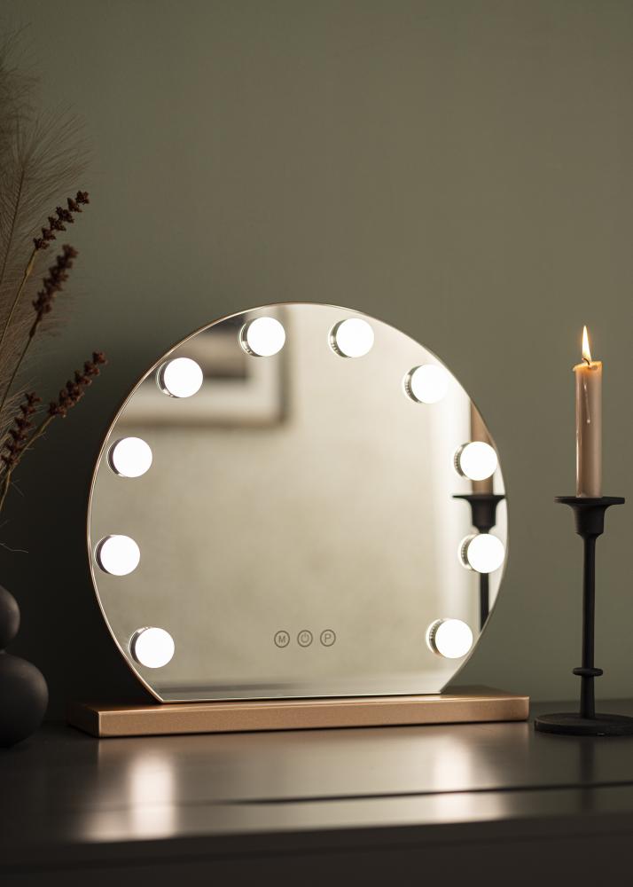 Dieser Hollywood Make-Up Spiegel zeichnet sich durch seine klassisch runde Form und die 10 großen LEDs, die die 40x30 cm große Spiegelfläche einrahmen, aus. Dadurch erhält dieser hübsche Hollywood Spiegel sein exklusiv und luxuriös wirkendes Design, das vom Ständer des Spiegels, der in einer trendigen, roségoldenen Farbnuance gehalten ist, zusätzlich betont wird. Die integrierte Beleuchtung des Make-Up Spiegels wird über eine Touch-Taste an der Vorderseite des Spiegels eingeschaltet. Farbtemperatur und Lichtstärke können nach Belieben eingestellt werden. Auch dafür gibt es praktische Touch-Tasten: Die mit einem "M" gekennzeichnete Taste dient zur Einstellung der Farbtemperatur und mit der "P"-Taste kann die Lichtstärke eingestellt werden. Es kann zwischen warmweißer, kaltweißer und natürlicher Lichtfarbe ausgewählt werden.