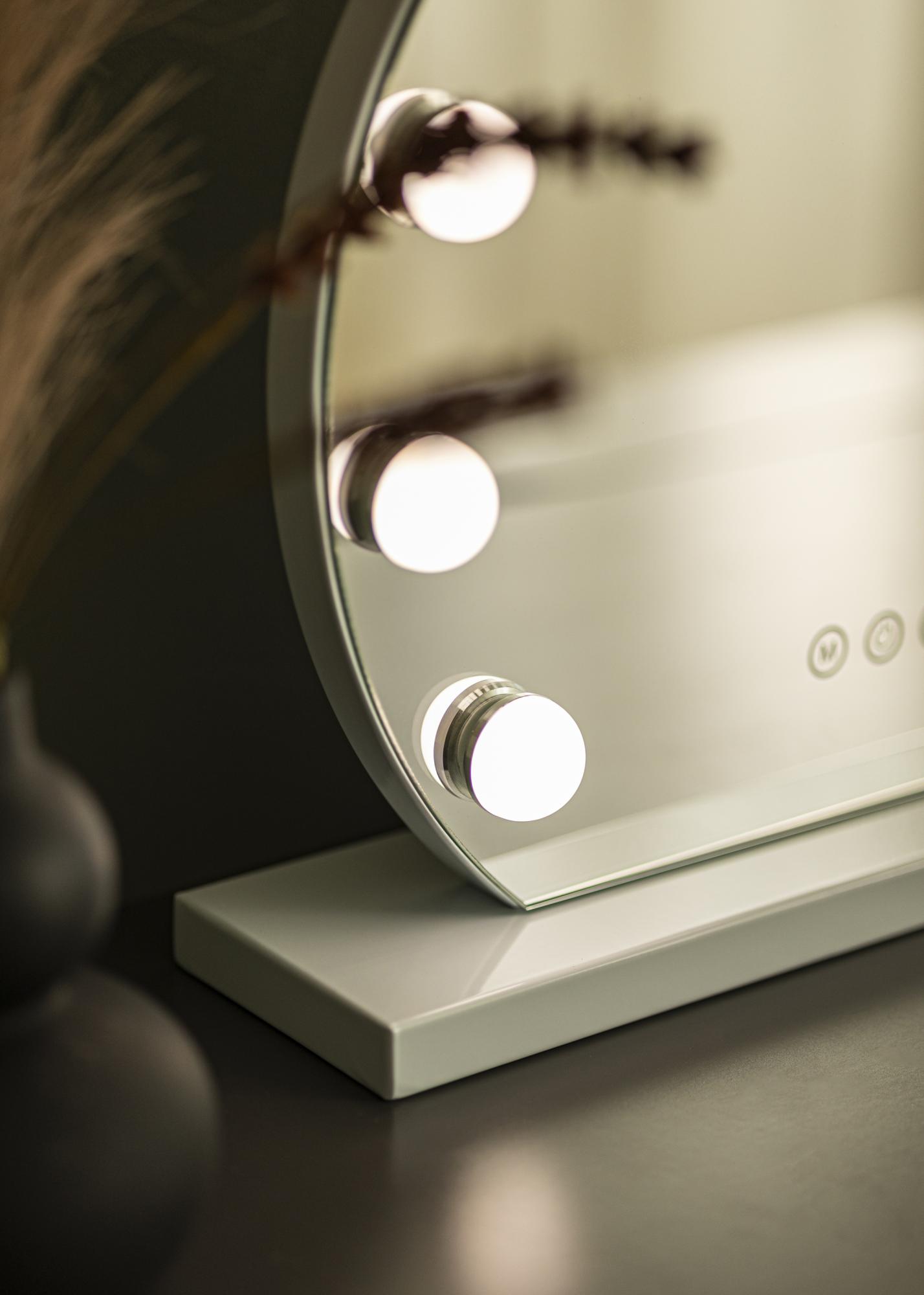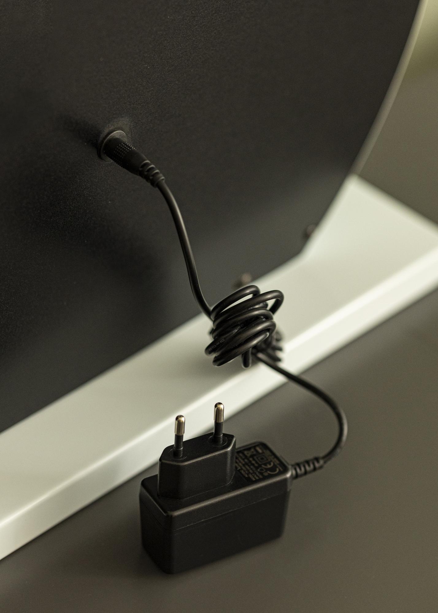 Dieser luxuriöse Schminkspiegel mit integrierter LED-Beleuchtung gibt einen gleichmäßigen Lichtschein ab. Die Beleuchtung besteht aus 10 LED-Lampen, die rund um den Spiegel nahe der Kante verlaufen und die Spiegelfläche hübsch einrahmen. Die Beleuchtung, sowohl die Lichtstärke als auch die Farbtemperatur, kann je nach Wunsch eingestellt werden. Die Einstellungen werden einfach durch Betätigen der Touch-Tasten, die mit verschiedenen Buchstaben gekennzeichnet sind, im unteren Teil des Spiegels vorgenommen. Mit der „M“-Taste kann die Farbtemperatur, eine kaltweiße, warmweiße oder natürliche Lichtfarbe, ausgewählt werden. Die „P“-Taste dient dem Dimmen und mit der AN-/AUS-Taste wird die Beleuchtung einfach ein- oder ausgeschaltet. Der Stromanschluss erfolgt über einen Stecker.