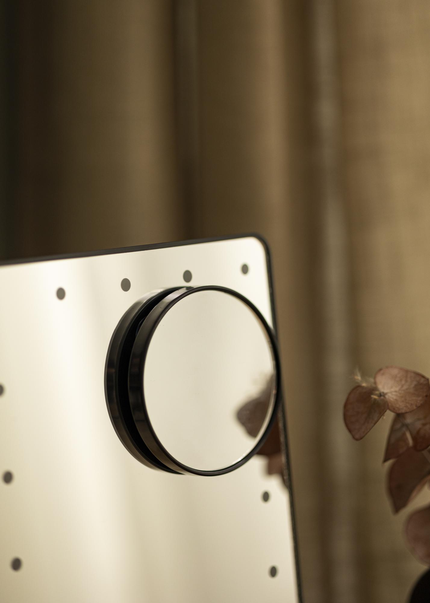 Der Spiegel besitzt ein smartes Design mit dimmbarer LED-Beleuchtung, die ein kaltweißes Licht abgibt. Die Beleuchtung wird mittels Taste auf der Rückseite des Spiegels ein- und ausgeschaltet. Um dich auch wirklich gut im Spiegel sehen zu können, ist der Spiegel drehbar und in der Neigung verstellbar, sodass die Position des Spiegels optimal ausgerichtet werden kann. Ein kleinerer Spiegel mit 2-fach und 3-fach Vergrößerung, der einfach auf der Spiegelfläche des großen Spiegels befestigt werden kann, ist im Lieferumfang enthalten. Der LED-Spiegel mit Lautsprecher ist mit einem eingebauten Lithium-Ionen-Akku ausgestattet, der via USB-Anschluss aufgeladen wird. Auch das Ladekabel ist im Lieferumfang enthalten.