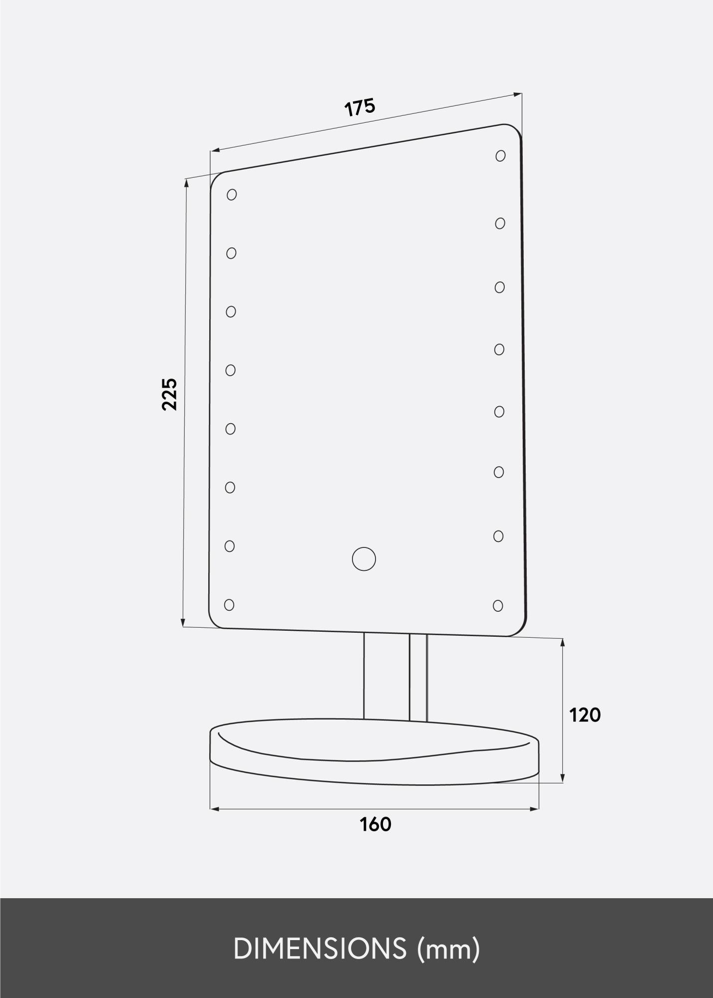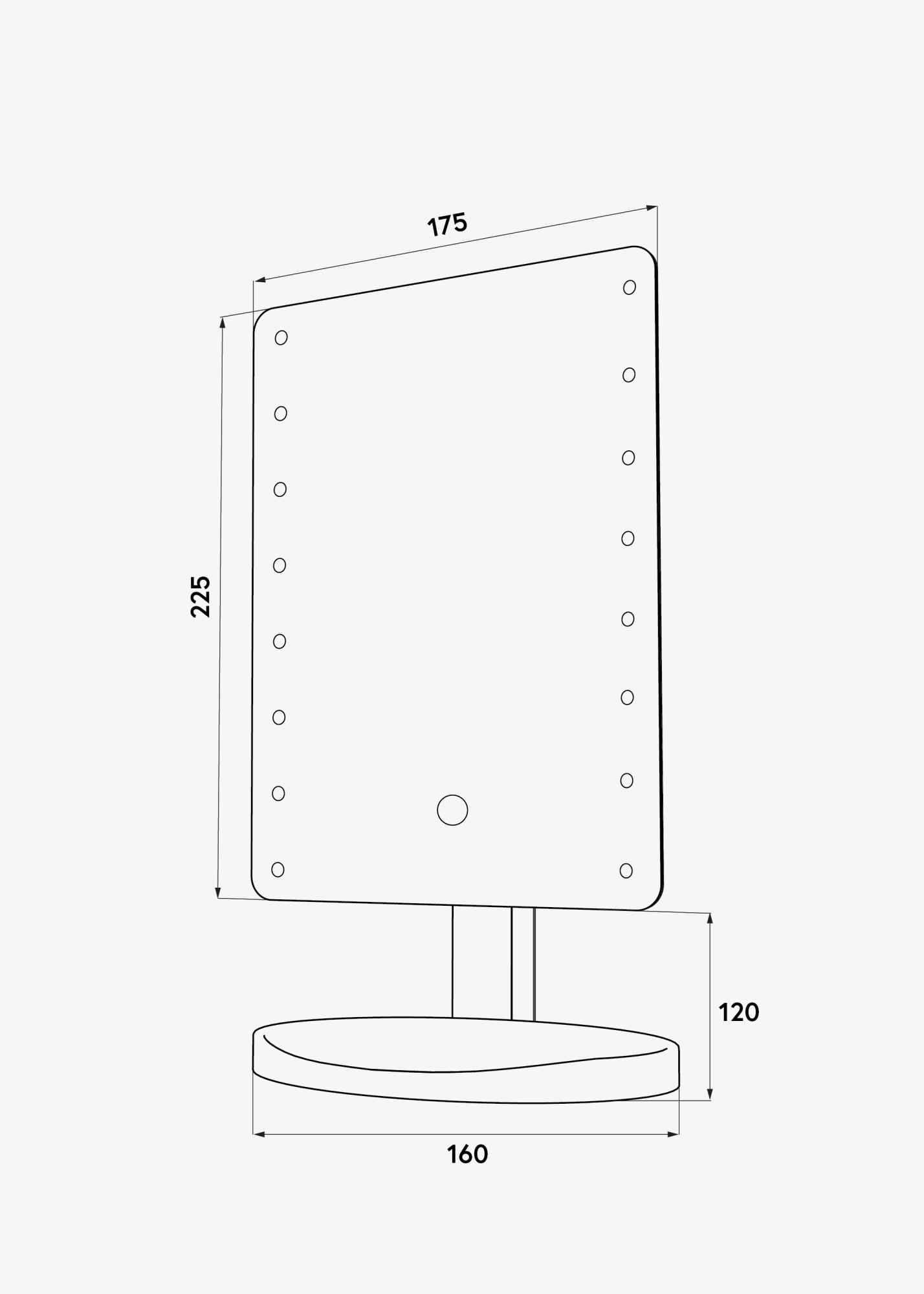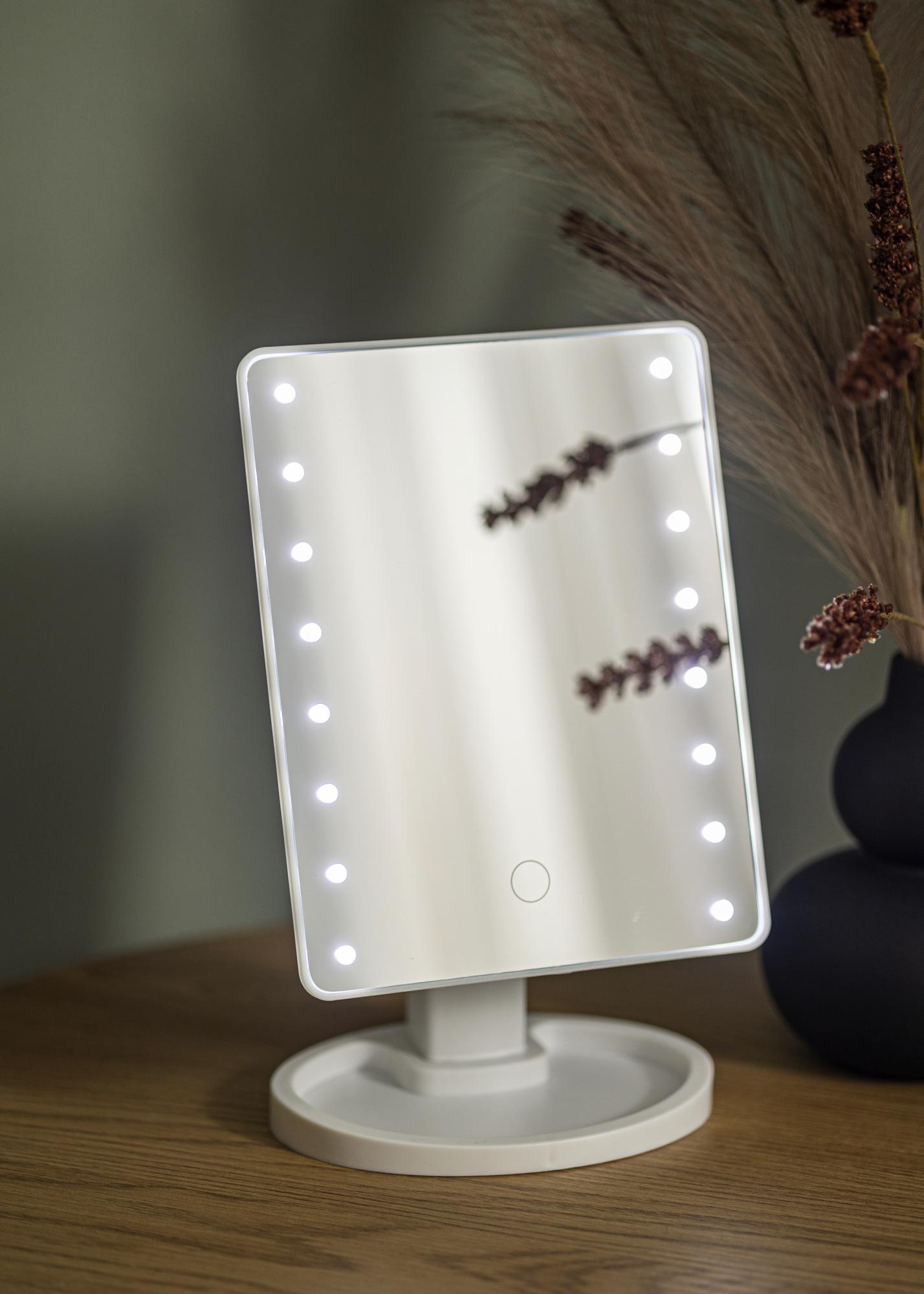 Der Schminkspiegel ist mit LED-Beleuchtung ausgestattet, die entlang der Seitenränder verläuft. Das Licht besitzt eine kaltweiße Farbtemperatur. Die Beleuchtung wird mittels Schalter auf der Rückseite eingeschaltet und mit Hilfe einer Touch-Taste auf der Frontseite kann nach Belieben gedimmt werden.
