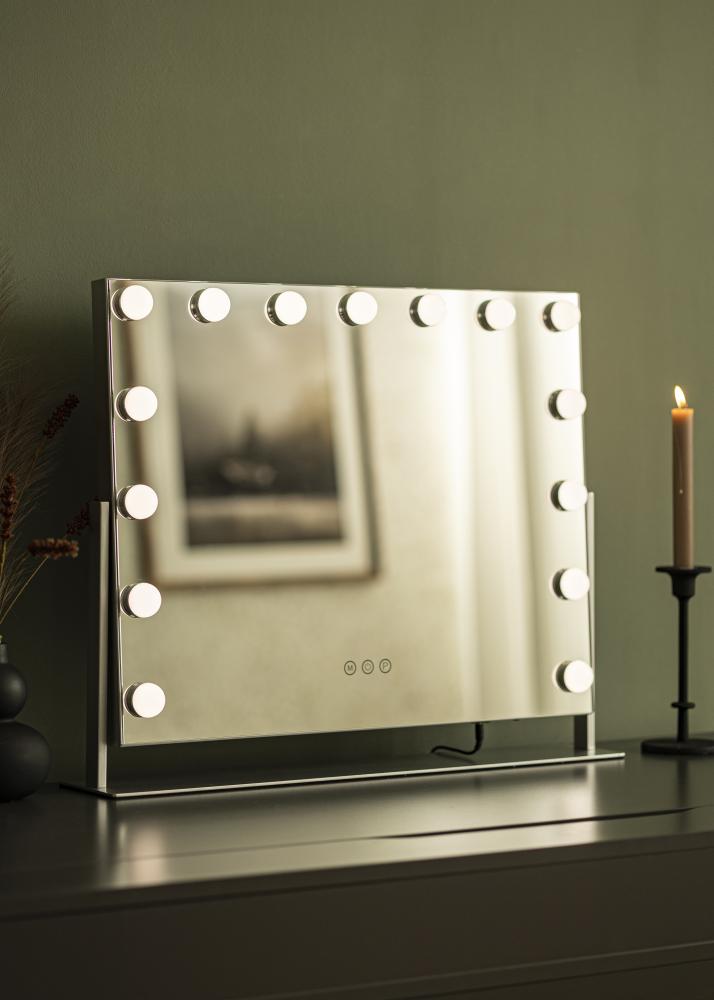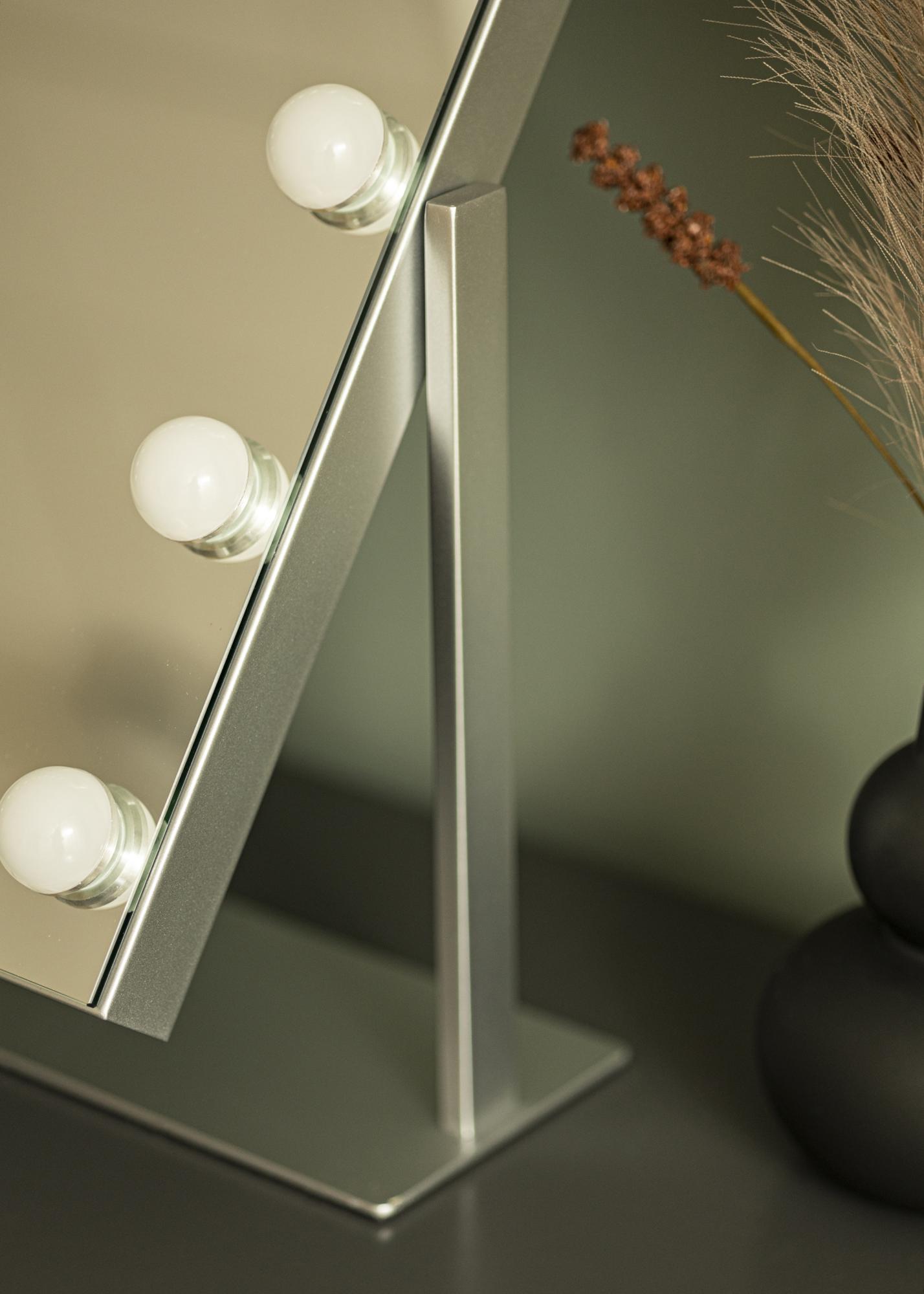 Dieser Spiegel wird mit einem stilvollen, silberfarbenen Standfuß geliefert. Der Spiegel kann im Neigungswinkel verstellt werden. An der unteren Kante des Spiegels befindet sich ein USB-Anschluss zum Aufladen smarter Endgeräte.