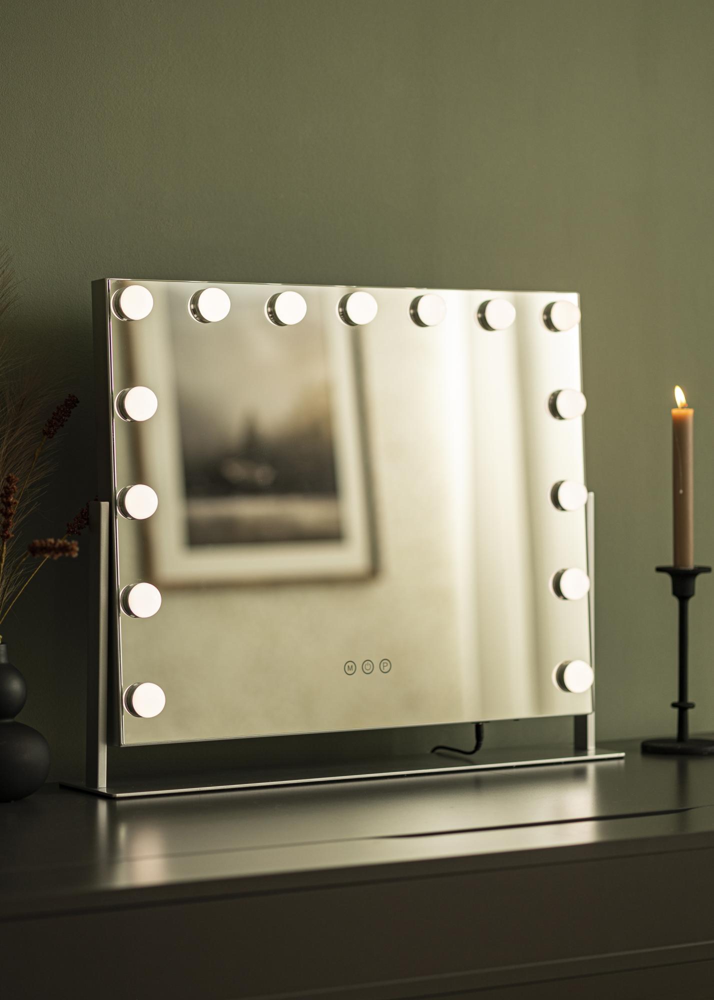 Ein eleganter Make-Up Spiegel kann jedem Raum zu einer glamouröseren, eleganteren Atmosphäre verhelfen. Dieser Kosmetikspiegel mit integrierter, dimmbarer LED-Beleuchtung kann zudem für eine besondere Stimmung sorgen, z.B. durch eine ansprechende Hintergrundbeleuchtung im Wohnzimmer oder ein helleres Licht in der Schminkecke am Schminktisch. Um die Beleuchtung je nach Situation und Bedarf anzupassen, werden einfach die Touch-Tasten im unteren Bereich des Spiegels genutzt. Die "M"-Taste dient zur Einstellung der Farbtemperatur und die "P"-Taste zum Einstellen der Lichtstärke. Außerdem gibt es eine Taste zum Ein- und Ausschalten der LED-Beleuchtung des Spiegels. Der Stromanschluss des LED-Spiegels erfolgt über einen Stecker.