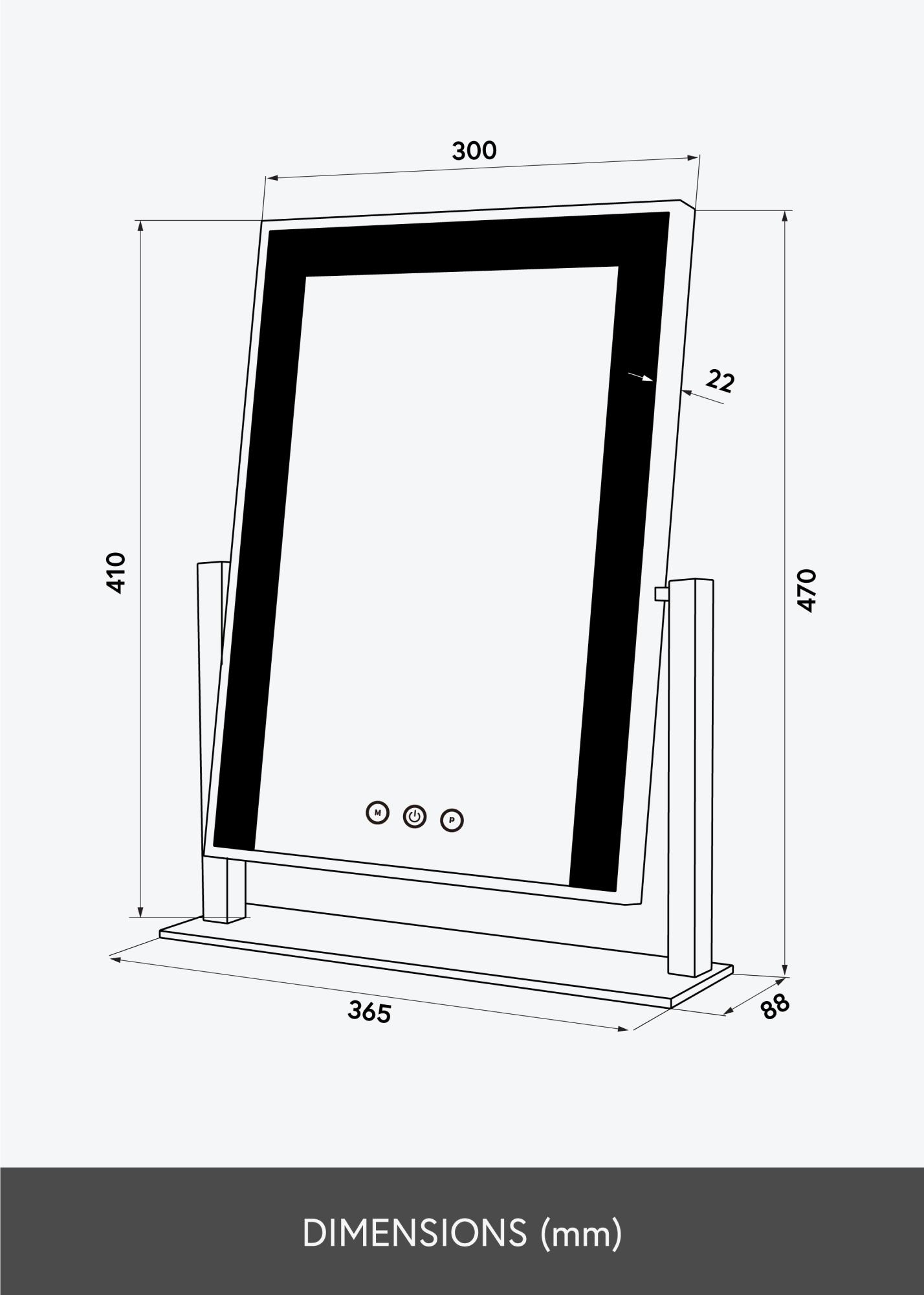 Dieser Schminkspiegel ist mit einem integrierten LED-Band ausgestattet, das die Spiegelfläche oben und an den Seiten hübsch einrahmt. Die LED-Beleuchtung des Spiegels kann einfach mit Hilfe einer Touch-Taste, die mit „P“ gekennzeichnet ist, gedimmt werden. Die Farbtemperatur kann mit der ”M”-Taste eingestellt werden. So können die Einstellungen der Spiegelbeleuchtung einfach und schnell, je nach Wunsch und Bedarf, geändert werden. Ein gedimmtes Licht eignet sich wunderbar als stimmungsvolle Hintergrundbeleuchtung, wohingegen eine höhere Lichtstärke beim Schminken und Auftragen von Make-Up vorteilhaft ist. Eine weitere Toch-Taste zum Ein- und Ausschalten der Spiegelbeleuchtung ist ebenfalls vorhanden. Der Stromanschluss des LED-Spiegels erfolgt über einen Stecker.