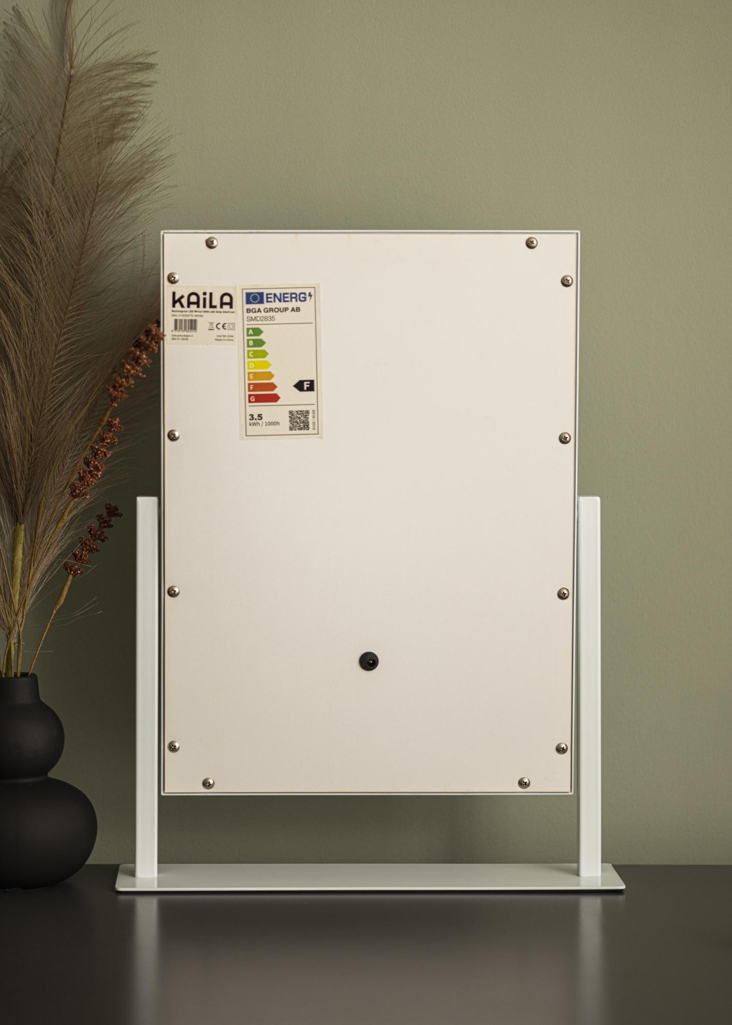 Dieser Spiegel mit Beleuchtung besitzt einen Standfuß aus Metall in elegant weißer Farbe, die dem gesamten Spiegel einen stilsicheren, ansprechenden Charakter verleiht. Dank des kompakten Spiegelformats, die Größe der Spiegelfläche beträgt 30x41 cm, findet dieser Schminkspiegel auf nahezu jedem Tisch, sei es Schminktisch, Esstisch oder Beistelltisch, Platz, sei es in Wohnzimmer, Schlafzimmer oder im Flur. Das clevere Design dieses LED-Kosmetikspiegels erlaubt auch ein Verstellen des Neigungswinkels. Der Spiegel mit integrierter LED-Beleuchtung wird über einen Stecker an den Strom angeschlossen.