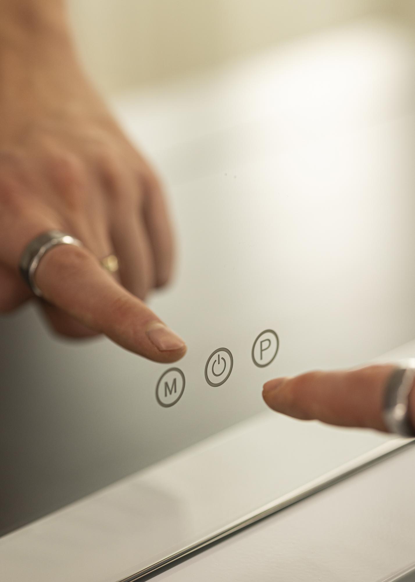 Lass diesen Kosmetikspiegel bei dir einziehen und erfreue dich an einem stilvollen, funktionellen Wohnaccessoire, das dein Zuhause verschönert! Die integrierte LED-Beleuchtung mit 15 großen LEDs, die wie ein Rahmen rund um die 80x60 cm große Spiegelfläche verlaufen, verleihen dem Spiegel einen sehr eleganten Ausdruck, der im gesamten Raum seine Wirkung entfalten und damit jedes Interieur aufwerten kann. Die LED-Beleuchtung des Spiegels kann nach Belieben angepasst werden, da sowohl Lichtstärke als auch Farbtemperatur bzw. Lichtfarbe eingestellt werden können. Die Einstellungen werden einfach mittels Touch-Tasten, die sich auf der Spiegeloberfläche befinden, vorgenommen. Die ”P”-Taste dient zum Einstellen der Lichtstärke und die „M“-Taste zur Auswahl der Farbtemperatur: warmes, kaltes und natürliches Licht. Der Stromanschluss erfolgt über einen Stecker.
