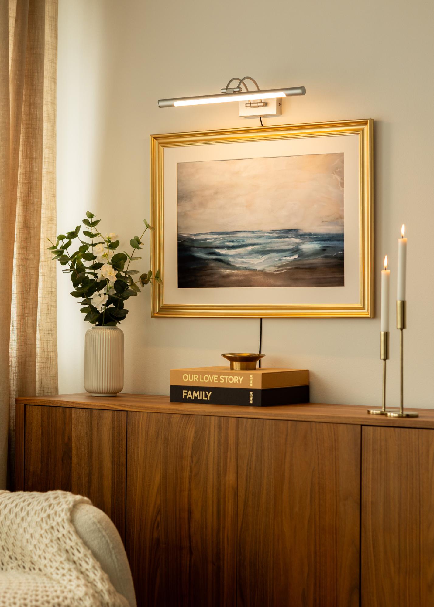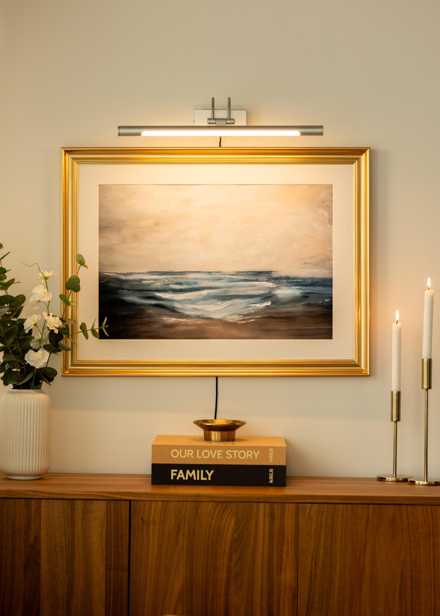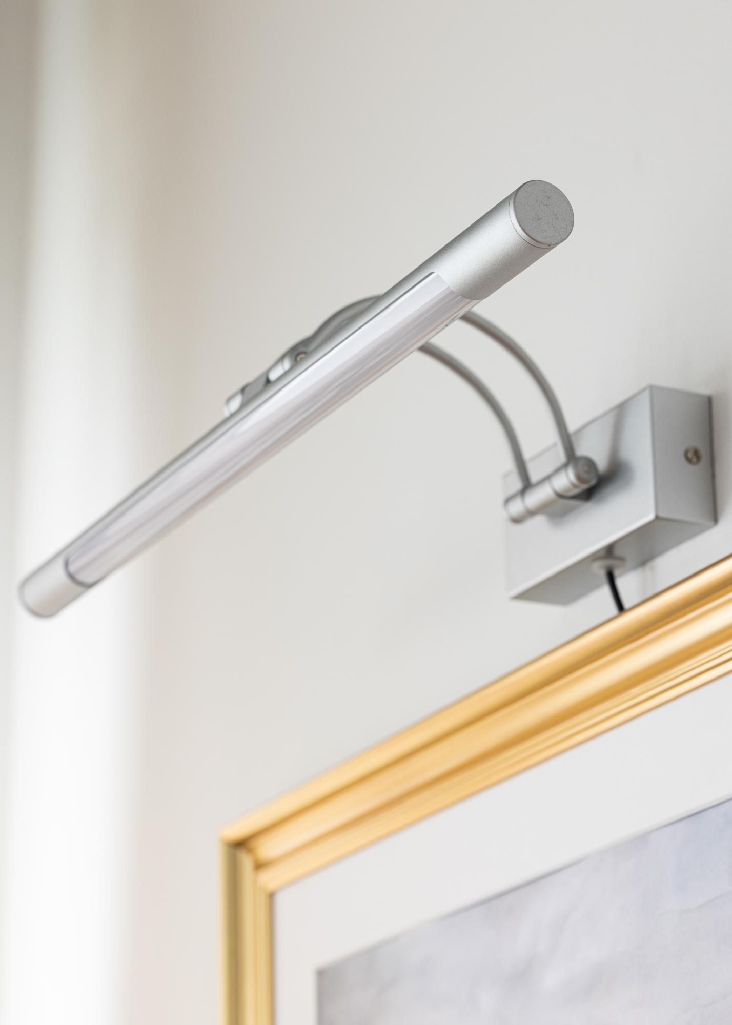Eine elegante Bilderleuchte in Silber, die diskret Ihre Kunstwerke hervorhebt. Mit den Maßen von 19 cm in der Tiefe und 50 cm in der Länge passt sie perfekt für Bilder mit einer maximalen Breite von bis zu 90 cm. Das Licht hat eine Farbtemperatur von 3000K, was ein warmes, einladendes Leuchten erzeugt, das eine angenehme Atmosphäre schafft, ohne den Raum zu dominieren.