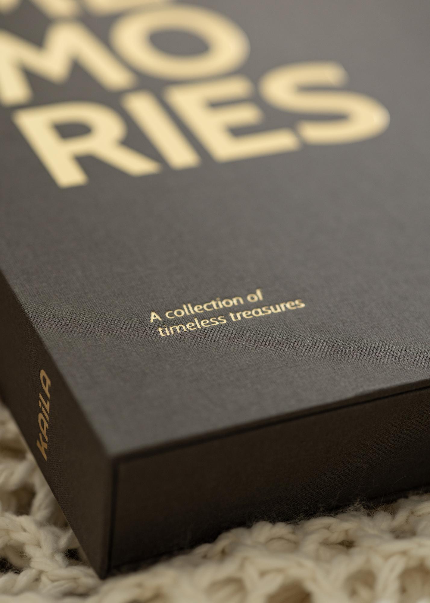 Das stilvolle Fotoalbum mit schwarzem Textileinband überzeugt zudem durch den Goldaufdruck mit dem Text ”MEMORIES” auf Albumdeckel und Albumrücken. Der Titel ”MEMORIES” wird durch den Untertitel ”A collection of timeless treasures” ergänzt, der in der linken Ecke unten auf dem Albumdeckel zu finden ist.