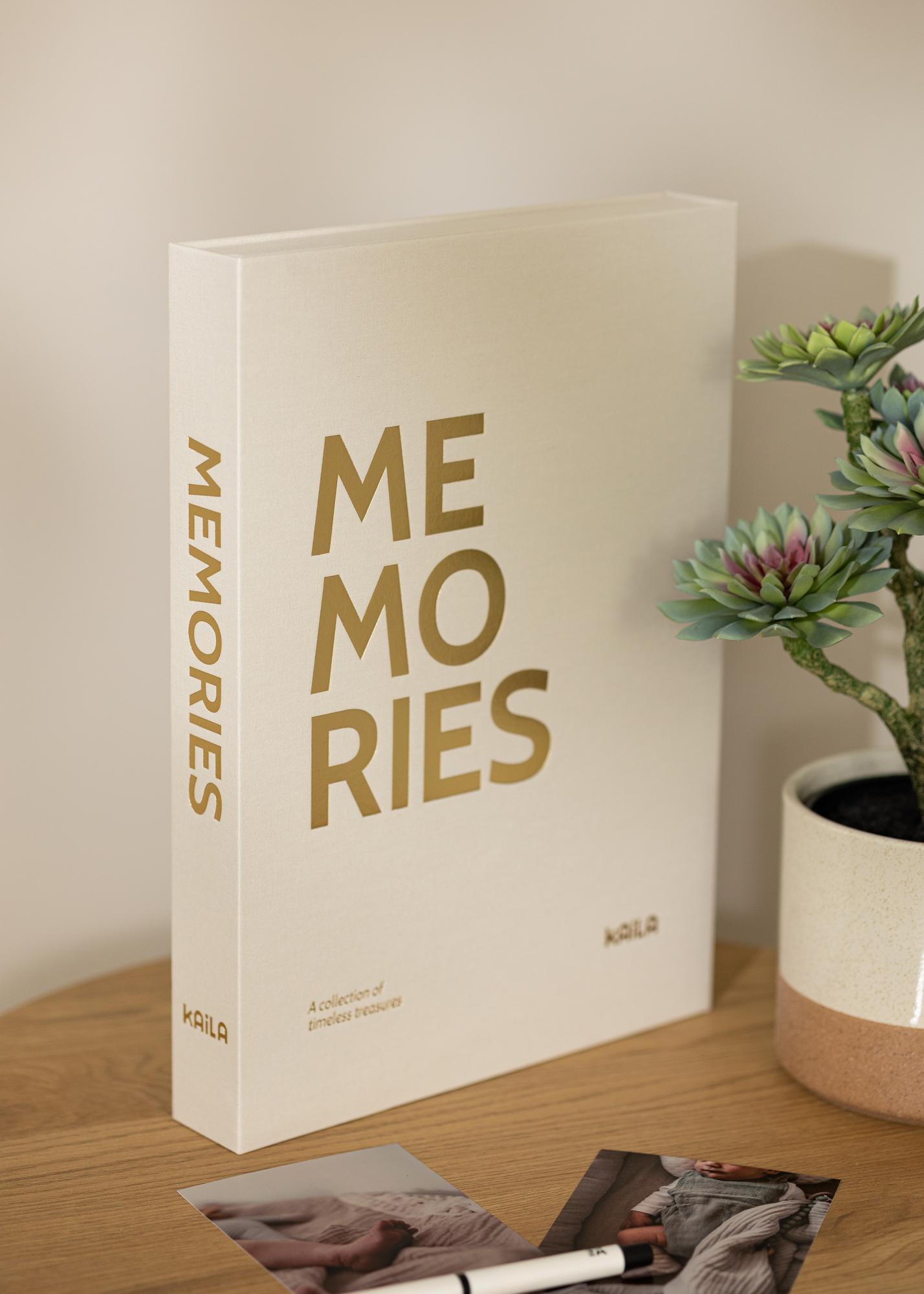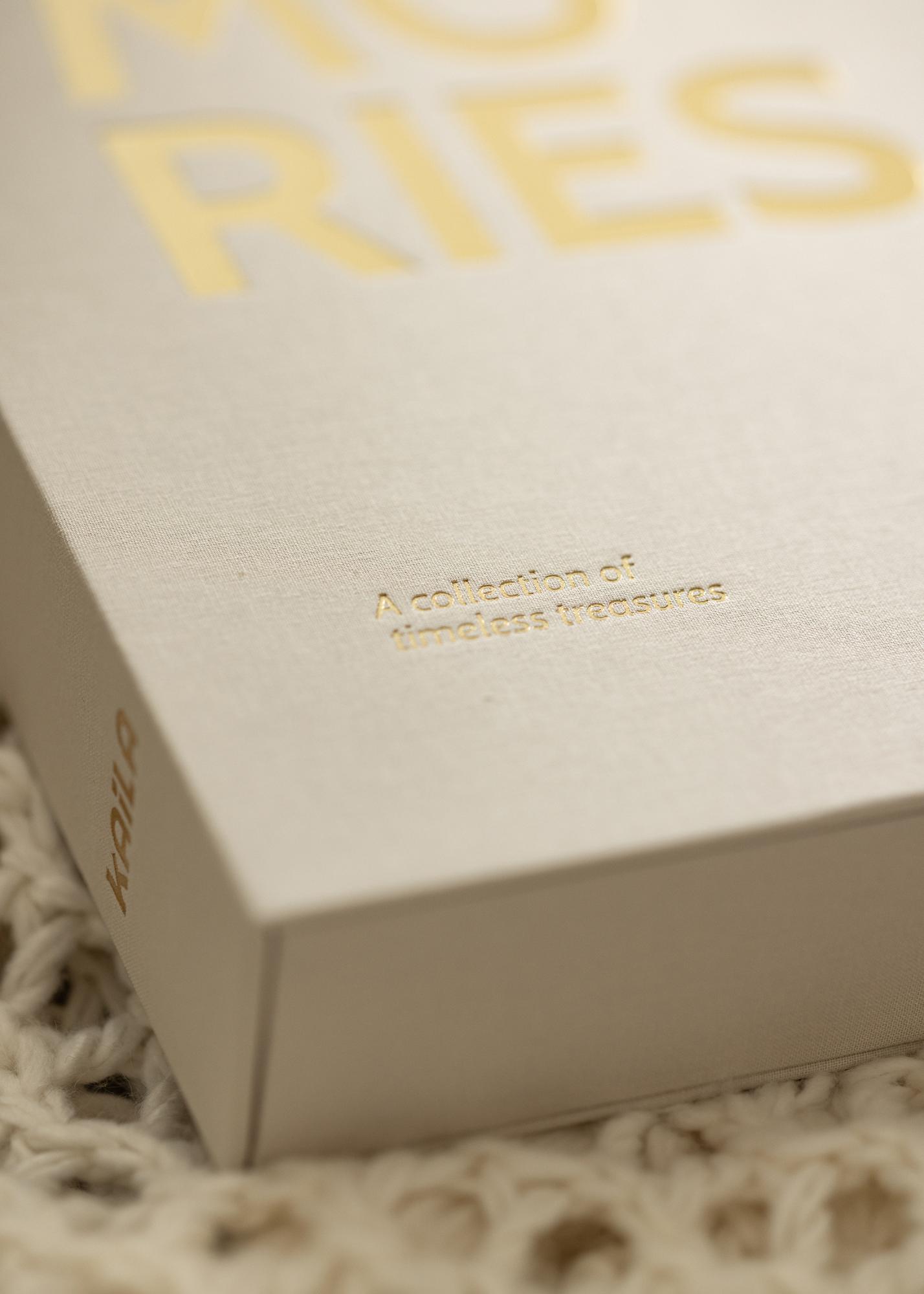 Das stilvolle Fotoalbum mit hellgrauem Textileinband überzeugt zudem durch den Goldaufdruck mit dem Text ”MEMORIES” auf Albumdeckel und Albumrücken. Der Titel ”MEMORIES” wird durch den Untertitel ”A collection of timeless treasures” ergänzt, der in der linken Ecke unten auf dem Albumdeckel zu finden ist.